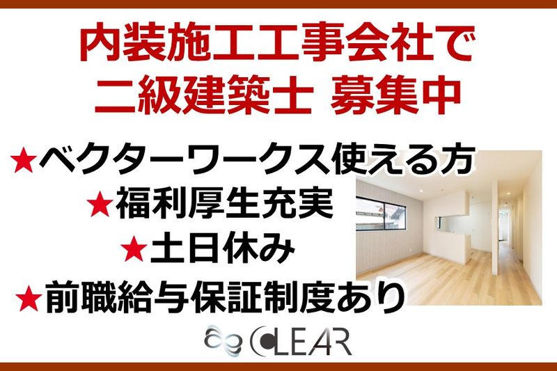 【アピールポイント】 【内装施工工事会社で二級建築士募集中】 ・ベクターワークス使える方 ・福利厚生充実 ・土日休み ・前職給与保証制度あり