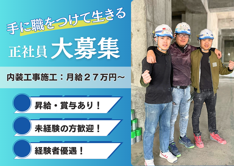 仕事内容 「ここで積むのは“キャリアの土台”。」 一生モノの技術と信頼を築く仕事がある。 私たちは、過去より“これから”を見る会社です。 経験も、学歴も問いません。 必要なのは、「変わりたい」という意志。 誰かに頼られ、必要とされ、自分の手で何かを作る。 そんな日々を、ここで一緒に始めませんか? ➡ どんなお仕事? あなたにお任せするのは、建物の内装をつくるうえで欠かせない「LGS(軽量鉄骨)」と「ボード貼り」 いずれかの施工です! LGSとは、壁や天井の下地となる細い鉄骨フレームのこと。 まずはこの骨組みを図面に合わせて正確に組み立てていきます。 その後、石膏ボードを貼り付けていくことで、室内の壁や天井の「形」が完成していきます。 どちらの作業が自分に合っているか迷っている方も安心してください。 実際に作業をしながら適性を見極め、あなたにピッタリの仕事を一緒に決めていきましょう! 自分のペースで無理なく成長できる環境です! 私たちの仕事は、たとえばこんな場所で活かされています: ・オフィスビルや商業施設の内装 ・大型商業施設などのテナントの改装 ・賃貸マンションや新築戸建ての内装仕上げ など 何もないスケルトン状態の空間に、壁や天井が生まれ、やがて完成する── そのダイナミックな変化を自分の手でつくり上げることがこの仕事の魅力です。 また、LGSやボード工事は屋内作業が中心のため、夏や冬の気候・雨天に左右されることがほとんどありません。 安定した環境で、身体への負担も少なく働けるのも特長のひとつです。 最初は難しそうに感じるかもしれませんが ・図面の見方 ・道具の使い方 ・作業の手順 など これらは先輩スタッフがしっかりと優しくフォローいたしますのでご安心ください! 職人技術=一生モノのスキル。 「手に職をつけたい」「モノづくりが好き」「完成した瞬間の達成感を味わいたい」 そんな想いをお持ちの方にピッタリの仕事です! ➡ 未経験の方も大歓迎! ・入社後は、現場で先輩の補助をしながら、道具の名前や扱い方などからゆっくり学べます! ・ 最初は「カット」や「短距離の運搬」など難易度の低い作業からお任せ! ・ 分からないことはすぐに聞ける、質問しやすい雰囲気です◎ ・作業は2~3人チームで進行。現場で一人ぼっち…なんてことはナシ! ➡働きやすさのポイント ・残業ほぼナシ! 無理のないスケジュールで毎日ほぼ定時帰り♪ ・天候に左右されない! 屋内作業が中心で、雨でも仕事がなくなる心配なし! ・直行直帰が基本! 現場への移動時間を効率化、プライベートも充実! ・おしゃべり多め。でも作業中はピシッと集中! ★材料の搬入ナシ! 重たい荷運びは専門業者さんが対応してくださるので、作業に集中できます! ➡ 給与・キャリアも魅力! ・頑張りを見逃しません!努力・実力をしっかり評価! 年齢に関係なく、あなたの頑張りはお給与にしっかり反映。 1年目で年収400万円以上も可能! ・独立支援制度あり! 当社から独立し、年収1,000万円以上を実現した職人も多数! 一生ものの技術と自信をここで手に入れましょう! ・あなたに合った働き方が叶います ・未経験で手に職をつけたい方 ・屋内で安定して働きたい方 ・家族や友達との時間も大切にしたい方 ・将来独立したい方 あなたの「こうなりたい」を全力で応援します! 【20代で現場リーダーも夢じゃない】 入社後のスケジュールと成長ステップ ➡ 入社〜1ヶ月:まずは“基礎づくり”から 現場でのルール、安全管理を学ぶ 道具の使い方、材料の運搬、先輩の補助からスタート 少しずつ“現場の空気”に慣れていく期間 ★「1ヶ月前の自分と比べて、ちゃんと“職人”に近づいてる実感がある。」 ➡ 1〜3ヶ月:小さな工程から“任される” 簡単な軽天(LGS)やボード貼りを自分でやってみる 自分の作業が現場全体にどう影響するか、を学ぶ 先輩のサポートを受けながら、1つずつ“できること”が増える ★若手が多い現場なので、同年代からも刺激を受けやすい! ➡ 3ヶ月〜半年:現場の“戦力”として活躍 部分的に工程を任せられるように 現場での指示出しや段取りに関わる機会も増える 「あの新人、いいじゃん」と言われるフェーズ ★「20代で現場の“段取り”をやるなんて思ってなかった。」 ➡ 半年〜1年:リーダー候補へ 小規模な現場での“リーダー的ポジション”に挑戦 工程管理、職人への報連相など 技術だけでなく、“人を動かす力”も磨かれる ★「年齢」より「信頼」で仕事が任される現場です! ➡ 1年以降:キャリアの選択肢が広がる 現場職長・管理者・独立 など、あなた次第 希望があれば、施工管理・営業・マネジメント職への道も! 若いうちから責任ある仕事を任されるそれがCRAFTの魅力。 上が詰まっていないから、チャンスが多い 結果を出せば、年齢関係なく評価される 「下積み10年」なんて古い話。ここでは“1年目から主役”になれます