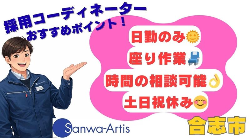 仕事内容 ☆子育て中でも安心の9時~17時☆ ※時間の相談も可能です♪ **★*☆¨*¨**★*☆*★**¨*¨*☆*★** * お仕事の内容 * **★*☆¨*¨**★*☆*★**¨*¨*☆*★** ○**作業台で組立作業**○ ✅小物部品のネジ締め ✅シール貼り などなど... ※小さなネジを取り扱う細かい作業です いずれも座っての作業がメインになります。 経験や資格は不問です♪ 先輩スタッフが優しく丁寧に教えますので 未経験さんでも安心して働けます! **★*☆¨*¨**★*☆*★**¨*¨*☆*★** * おすすめポイント * **★*☆¨*¨**★*☆*★**¨*¨*☆*★** ✨かんたん軽作業 ✨プライベート充実 ✨うれしい日勤のお仕事♪ ✨無料駐車場、駐輪場あり ✨各種保険完備(即日加入OK) ✨髪色自由♪ ✨未経験者大歓迎 ✨資格、学歴一切不問 ✨先輩方が優しく指導します ✨屋外喫煙所あり ✨スピード面談&スピード採用あり ✨オンライン面談随時受付中 *お家にいながらできます 20代~30代スタッフ活躍中(^^)/ **★*☆¨*¨**★*☆*★**¨*¨*☆*★** * 職場見学可能 * **★*☆¨*¨**★*☆*★**¨*¨*☆*★** 「お仕事が気になる(・x・)」 「実際に会社の中を見てみたい( ・▽・)」 という方は、事前に職場見学も ありますので、お気軽にご相談ください♪ 皆さまにお会いできる事を サンワアルティス株式会社スタッフ一同、 心より楽しみに お待ちしております(o・v・)b 2257910