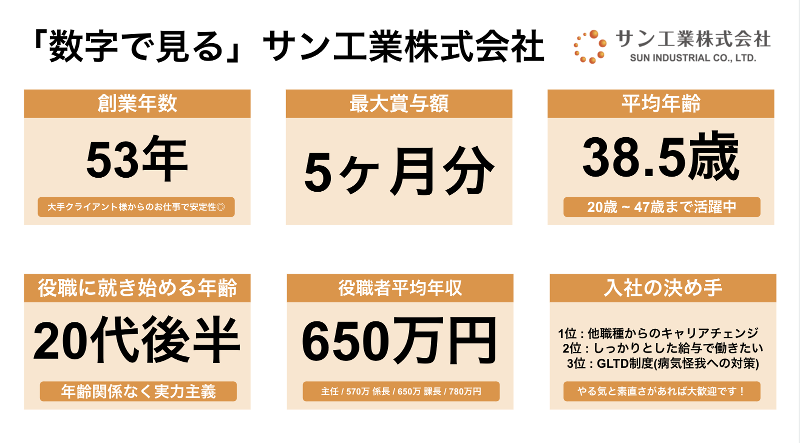 仕事内容 ✼┈〈この求人のおすすめポイント!〉┈✼ ✅必要なのは普通運転免許だけ (AT限定可) ✅建設・空調業界などの 現場職からも転職OK! 2年で一生モノのスキルを 習得できます! ✅賞与年2回! 決算賞与もあるので社員への 還元に自信があります! 手当も充実しており 若くして高収入を実現可能✨ ✅月平均残業時間は30時間ほど! ―――――――――――――――――― 「建設業界は、未経験だと難しそう」 「なんとなく、古い体質が残っていそう」 もし、あなたがそんなイメージをお持ちなら、 私たちサン工業は、 少し意外に思われるかもしれません。 業績好調につき、 新たに2名の「育成枠」を採用します。 これまでの経験は一切問いません。 【サン工業の仕事とは?】 私たちは、誰もが知る 大手回転寿司チェーン店や牛丼店、 学校などに設置される 「業務用エアコン」の施工を行っています。 あなたにお任せしたいのは、 そのエアコン設置工事が スムーズに進むよう 「管理」するお仕事、 "施工管理"です。 【未経験でも安心の研修体制】 「"管理"なんて難しそう」 「経験も資格もないのですが…」 ご安心ください。 今いるメンバーも、社長自身も、 みんな現場の経験者です。 未経験の方の不安はよく分かります。 ⏩STEP 1:まずは「知る」ことから 最初は先輩に同行し、現場の雰囲気を 知るところからスタート。 「職人さん、お疲れ様です!」 まずは元気な挨拶ができれば十分です。 ⏩STEP 2:次に「覚える」 道具の名前、工事の流れ、 図面の簡単な見方など…。 少数精鋭の組織だからこそ、 あなたのペースに合わせて マンツーマンで丁寧にお教えします。 ⏩STEP 3:そして「実践へ」 簡単な書類作成(PC使用)や 現場の写真撮影から少しずつお任せします。 2年もすれば、 一生モノの 専門スキルが身につきます。 【サン工業が「選ばれる」理由】 ✅1. "昭和"のイメージを脱却 私たちは本気で「無駄な会議ゼロ」 を目指しています。 勤怠管理はクラウド化、 情報共有はSNSを活用。 (もちろんノートPCも支給します) 非効率な「昔ながら」の慣習を 積極的に見直しています。 ✅2. 抜群の「安定性」 創業53年。 大手チェーン店との取引多数。 売上は少数精鋭で10億円以上。 景気に左右されにくい安定基盤が強みです。 ✅3. 「高還元」と「安心」の両立 頑張りは賞与(最大5ヶ月)で還元。 さらに、もし万が一、病気やケガで 長期間働けなくなっても… 最長65歳まで給与をサポートする 「GLTD保険」に会社負担で加入。 将来の不安もしっかりサポートします。 必要なのはAT免許だけ。 「やってみたい」その気持ちを応援します。 ■当社の強みをご紹介! ━━━━━━━━━━━━ ✅年齢関係なく稼げます! ━━━━━━━━━━━━ 社員の平均年齢は30代。 賞与最大5か月分、 さらに頑張った分を給与に 反映する仕組みをとっています! ━━━━━━━━━━━━━━━━━ ✅転勤なし。時々出張で気分転換♪ ━━━━━━━━━━━━━━━━━ 当社の取引先は福岡を中心に、 九州エリア、中国四国エリアと 幅広いです。 遠方の案件は、WEB会議サービスを使った オンライン会議を中心に進めますが、 工事期間中に数回は1泊2日程度の出張で 現地にも顔を出します。 出張先で仕事をして、地場の美味しいもの を食べる。出張は気分転換にもなります♪