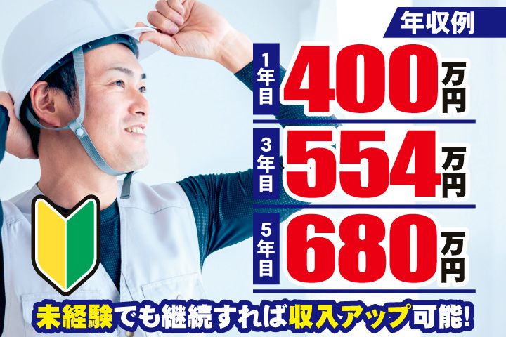 月給280,000円以上 給与 月給280,000円〜 基本給280,000円~+別途各種手当あり 【年収例】 〇1年目400万円→3年目554万円 〇1年目400万円→5年目680万円 未経験スタートでも継続すると収入アップ!