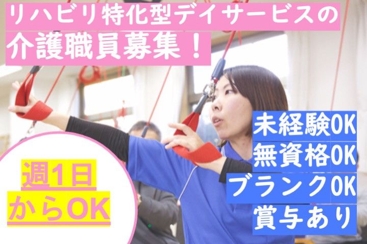 【アピールポイント】 リハビリ特化型デイサービスの介護職員募集! ●週1日からOK! ●未経験OK! ●無資格OK! ●研修あり