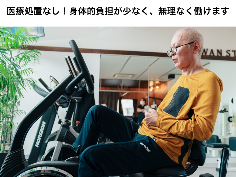仕事内容 \介護×エンターテインメント!/ 施設内は…まるでトレーニングジム! オープニングスタッフ募集! *高時給1500円!短時間で賢く稼げる! *平日4.5時間勤務!育児・家事との両立◎ *医療処置なし!バイタル測定がメイン *土日休み&残業なし!自分時間も確保! 【仕事内容】 6月オープンに伴い、スタッフ大募集! 施設内ではトレーニングマシンでの運動やオンラインリハビリを導入! 利用者様が「やりたいこと」を続けられるためのカラダづくりを、看護の視点で見守るお仕事です。 ~具体的には~ *ご利用者様のバイタルチェック(血圧・体温測定) *健康状態の管理・相談 *機能訓練の補助 *タブレットを使った簡単な記録入力 ★難しい医療処置や、重度の身体介助はありません!ブランクある方も大歓迎♪ \はじめての介護業界でも大丈夫!/ 当施設は、スタッフの経験に頼る従来のレクリエーションではなく、「トレーニングマシン」「オンラインリハビリ」など、 カラダづくりのためのコンテンツを提供! 介護の仕事が未経験でも楽しみながらサポートできます! ━━━━━━━━━━━━━━━━━━━━━ ▶6月に新規オープン! 介護のイメージを覆す”大人のフィットネスジム”  ̄ ̄ ̄ ̄ ̄ ̄ ̄ ̄ ̄ ̄ ̄ ̄ ̄ ̄ ̄ ̄ ̄ ̄ ̄ ̄ ̄ 綺麗な職場&高時給1,500円! ご利用者様が「やりたいこと」を自立して楽しむスタイルです! 西原町エリアでも珍しい時給1,500円という高待遇で、スマートに効率よく収入を得られます! 昼食の半額補助があるのも嬉しいポイントです★ ▶『10時出勤・15時退勤!』 を叶える理想のワークライフバランス!  ̄ ̄ ̄ ̄ ̄ ̄ ̄ ̄ ̄ ̄ ̄ ̄ ̄ ̄ ̄ ̄ ̄ 主婦さん中心に活躍中です♪ 朝は子供を送り出し、掃除や洗濯を済ませてからゆとりを持って出勤。15時には仕事が終わるので、夕飯の買い物や夕方の家事にも余裕を持って間に合います。 残業も一切ないので、オンとオフの切り替えがバッチリです★ ―――――――――――――― 【株式会社WAN STYLE】 那覇・沖縄市・うるま市など、デイサービスを4ヵ所・シニアサロンを1ヵ所・居宅介護支援事業所を3ヵ所、展開している会社です! <当社の魅力をもっと知りたい方に!> ▼▼ホームページもご覧ください▼▼ https://www.wan-style.okinawa/ ――――――――――――――