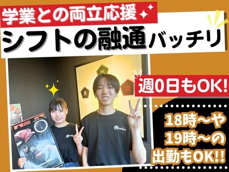 仕事内容 【イベントラッシュの冬、大学生集合ー!!】 クリスマス・忘年会・新年会...冬はイベントラッシュなのに、 お金がない現実と向き合っているそこのキミ! 大丈夫、まだ間に合う! 後期の授業スケジュールに合わせて、 がっつり稼げるバイトがここにあります◎ <仕事内容の詳細> ディナータイムの接客を中心とした ホールスタッフのお仕事です。 <具体的には> ・お客様のご案内 ・オーダー取り ・料理の配膳 ・レジ対応 ・テーブルのセッティング ・店内の清掃 ◎接客バイトが初めての方も大歓迎! バイトを通じて話し方や接し方など 自分の成長を実感できますよ◎ 【なんでみんな続けてるの?】 ★(土日祝)深夜1625円~の高時給で効率よく稼げる! ★17:00~だから授業・サークル後でもOK ★週3でも月5万円以上稼げる! ★未経験でも先輩が優しく教えてくれる環境 <リアルな1日の流れ> -17:00 「お疲れー!」授業終わりで直行 -18:00 簡単な盛り付けからスタート -20:00 慣れてきたら他の作業もお任せ -22:00 深夜時給スタート!時給UP◎ -23:30 終了!明日の1限も余裕で間に合う 【現役大学生スタッフの声◎】 ■理由1:お金の話、リアルにします 「時給の高さは本当に魅力!深夜1625円~は正直助かる。 テスト週間でシフト減らしても平日週3で月5万円以上稼げる。 これで家賃も生活費も、冬のイベント代も全部カバーできてます」 ■理由2:バイト仲間が最高 「同じ大学の子、近くの専門学校の子もいて、 シフト後にみんなでご飯行ったり、休みに遊んだり。 『バイト先で親友ができた』って本気で言える環境です」 ■理由3:学校との両立がしやすい 「店長が学生の事情を分かってくれる人で、 『テスト前は勉強優先して大丈夫だよ』って言ってくれる。 部活の大会とか旅行の予定も柔軟に調整してもらえます」 そして!育ち盛りの(?)学生に嬉しい、 食事補助あり!! 炙りバラカルビ、きんぐカルビ、やきつきハラミ 石焼ビビンバ、アイスやケーキのデザートなど が食事補助で食べられます♪ \新しいバイト仲間、募集中!/ 「バイト始める前は部活との両立が心配だったけど、 実際は先輩めっちゃ優しいし、予定も尊重してくれる。 同年代の友達できて毎日楽しいです♪ 未経験でも全然大丈夫だから、まずは気軽に見学に来てください!」 (大学2年・Sより)