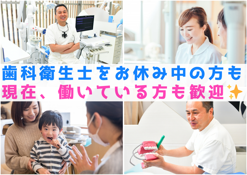求めている人材 歯科衛生士資格をお持ちの方 ブランクがある方も歓迎なので 安心して復職できる環境です。 当院には40~50代の ベテランスタッフが在籍しておりますので、 手厚くサポートが出来る体制です。 また、長い間お休みされていた方も、 歯ブラシ指導など簡単なお仕事から始め、 徐々に慣れていって頂ければ幸いです。