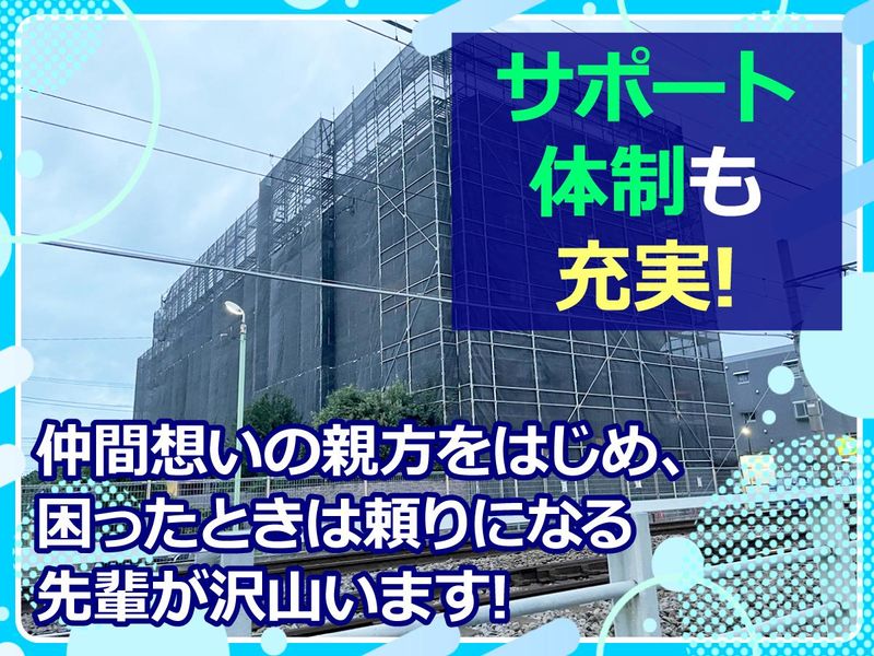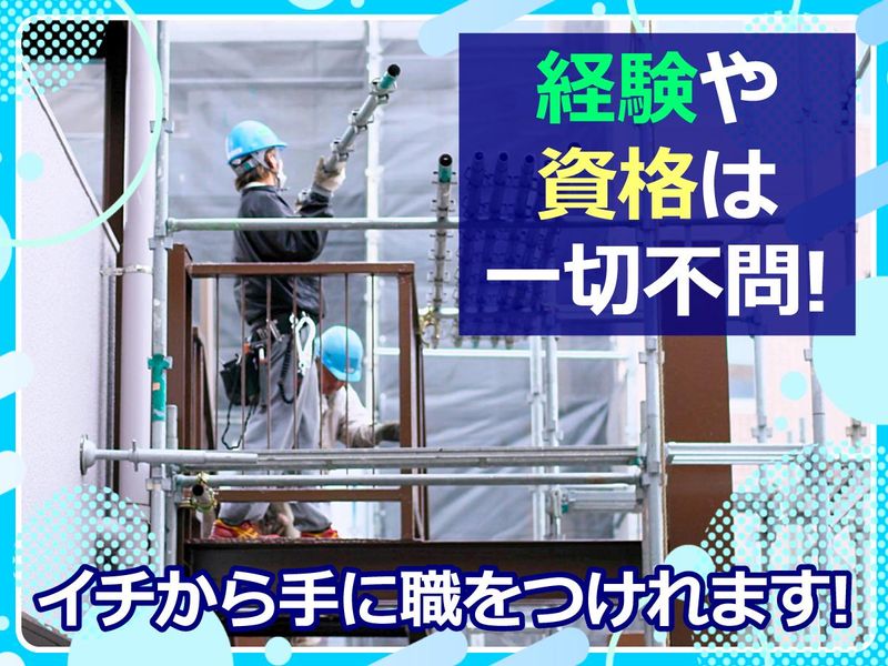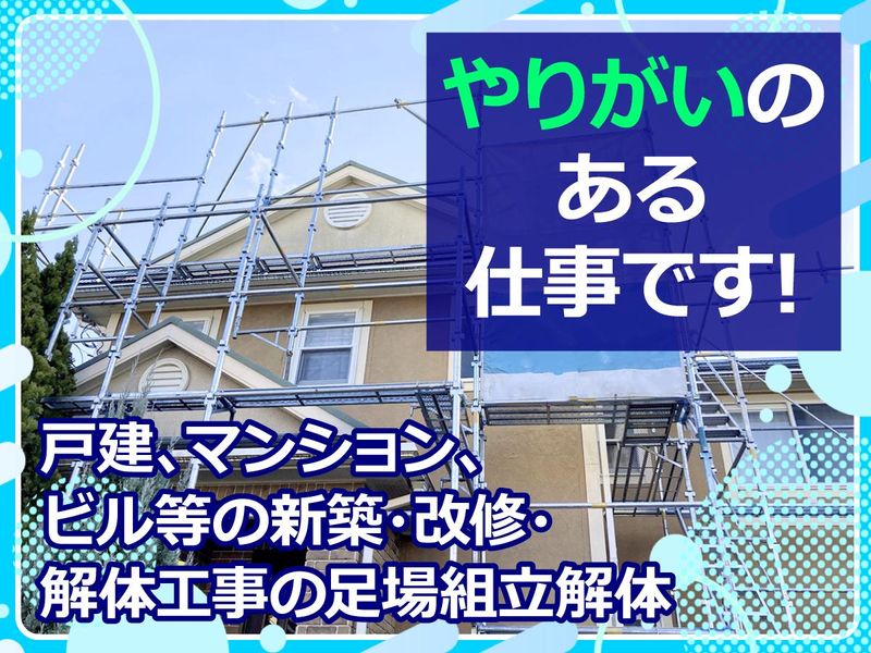 仕事内容 とび職大募集!未経験の方から経験者の方まで幅広く大募集! 現場は、阪神間を中心に、京阪神一円になります。 月給30万円~のスタート! 準中型・中型免許ある方大募集! 2t・3t・4tトラック運転できる方歓迎です! ◎戸建、店舗、マンション、ビルの新築・改修・解体工事の足場組立解体です。 未経験者でも丁寧な指導で安心して始められて手に職を付けられます。 いつまでたっても材料を運んで渡しての作業ばかりで先が見えずやりがいを感じていない現在足場屋さんで働いている方には、 組立解体作業を簡単ところからやってみて徐々に覚えて足場屋のやりがいを感じていただきたいと思っています! 未経験の方は、まずは手元作業からスタートして頂きます。 経験者の方はやり方が違うかもしれないので、仕事の流れをみていただき即戦力として活躍して頂きます! 20代・30代・40代・50代の若手からベテランが活躍中! 人間関係に悩まず働けるので安心! 教育サポートも整っているのでスタートしてみませんか! 業界トップクラスの技術が身に付きますよ! ◎暑さ対策としてこまめな休憩をとるようにしています。そのほか、親方から水分補給としてドリンクの支給など無理なく働ける環境を整えています。 ◆<親方より一言!>―――――――― 最初は出来ないことだらけで当然! まず、手伝い程度の軽作業からスタートして、1つずつ確実に覚えてもらえれば、 未経験からも、一人前の職人に育てます!