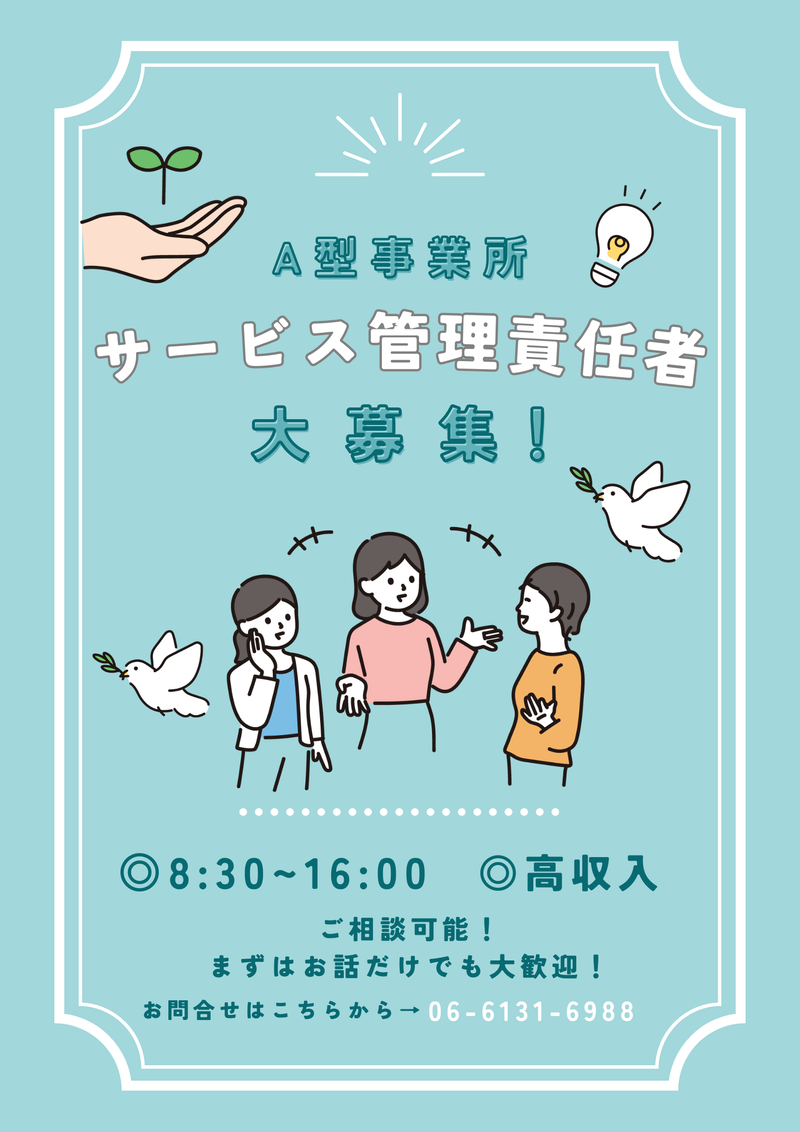 仕事内容 サービス管理責任者としての配置が可能な方、大募集!!! ※サービス管理責任者資格を お持ちの方のみの求人です 利用者さんに寄り添い、関わりながら 業務を行っていただきます。 マニュアルが完備されており、 滞りなく業務を進めていくことが 可能なため、とても働きやすい 環境を大事にしている事業所です! 本部、スタッフと連携しながら 無理のない業務量で働けます。 実働6.5時間・残業ほぼなし✨ 駅チカでアクセス◎ 【長く続けられる職場】を 探している方にぴったりです。 【業務内容】 ・個別支援計画書の作成、定期見直し ・利用者の方々へアセスメントや モニタリング、個別相談、指導 ・行政対応 ・書類作成等の社内業務 ※ほかの営業所や外出などで 社用車を使用することがあります。 など… ◇A型事業所でのサビ管業務を 担当して頂きます ※紹介予定派遣の募集です。 紹介は派遣先と本人の同意が 得られた場合のみ行います。 ※派遣期間1ヶ月~6ヶ月