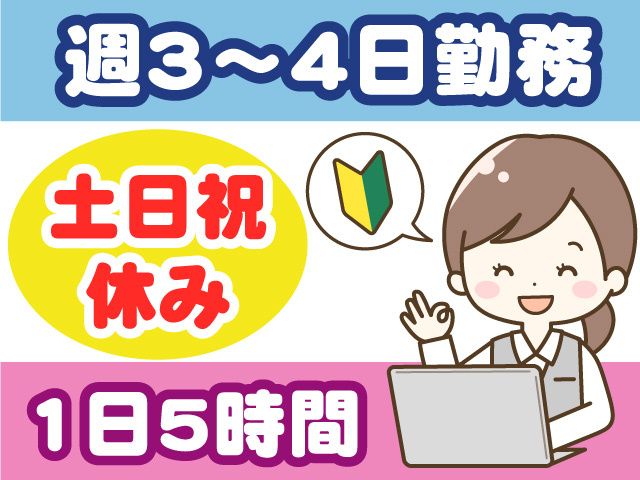 仕事内容 パソコンによる請求書作成、 データ入力などの事務業務全般。 【ポイント】 週3~4日の勤務でOK! 土・日・祝はお休みで、 長期休暇もしっかり取れます! 15時までの勤務ですので、 仕事が終わってからの予定も立てやすく、 プライベートも充実できます! お子様がいらっしゃる方でも、 働きやすい勤務日数・時間となっております! 経理事務経験ある方オススメ! 能力に応じて時給大幅UP 基本的なPC操作が出来ればOK! 分からない事があれば、 しっかりと指導致しますので、 無理なく安心して業務をスタート出来ます! ブランクがある方なども歓迎です。 不安な点は気軽に相談して頂ければ、 サポート致しますのでご安心ください。 【職場環境】 当社は創業以来、 会話を大切に、コミュニケーションをしっかり取りながら、 業務に取り組んで参りました。 その為、従業員同士も仲が良く、 明るく笑顔が絶えない職場環境が整っております! また、年2回の健康診断を徹底して行っており、 従業員の体調管理にも常に気を配っております! 当社は従業員ひとりひとりを大切にすることを 心がけています!! ご不明な点等ございましたら、 お気軽にお問い合わせください。 ※面接日や入社日、質問もお気軽にご相談ください!