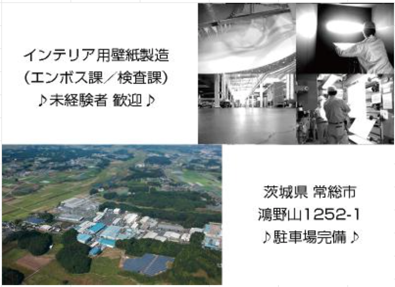 仕事内容 \ 東証一部上場「株式会社カネカ」グループ会社/ 壁紙作りのプロフェッショナルを目指しませんか? <未経験OK> 本ポジションの9割以上が未経験! <応募資格> 39歳以下の方 ( 例外事由 3号 イ 長期勤続によるキャリア形成を図る為) <給与待遇> 安定給与+豊富な手当+賞与年3回(8ヶ月) <面接方法> 面接は1回のみ! < 企業HPもご覧ください > 企業HP:https://www.tobu-kagaku.co.jp/index.html ///////////////////////////////////////////////////// 【 ご応募について 】 Indeedからカンタン応募 画面下部の「応募画面へ進む」から 必要事項を入力して応募完了! WEB : Indeed (365日24H受付中) 電話 : 0297-43-7071(採用担当宛) ///////////////////////////////////////////////////// ━━━━━━━━━━━━━━━ ✿この求人のおすすめポイント✿ ━━━━━━━━━━━━━━━ ✅国内業界トップクラスメーカーで カネカグループの1社 1982年の創業以来 赤字決算なしの超安定企業! ✅嬉しい賞与年3回 (昨年度実績8.0ヵ月分) 住宅手当や交代勤務手当など 福利厚生充実! ✅未経験歓迎! 必要な資格も会社負担で取得可! めでたく合格した場合は 「資格取得奨励制度」の規定に沿って 1~7万円の奨励金が支給されます。 ✅丁寧な研修制度!3ヶ月間を目安に、 教育担当者と一緒に 業務を身につけていただきます。 ✅キャリアは縦にも横にもチャレンジ可能! キャリアアップ・チェンジを図りながら、 長く働ける環境を整えています。 ✼┈┈┈┈┈┈┈┈┈┈┈┈┈┈┈┈✼ 《仕事内容》 壁紙作りの トップクラス企業で働きませんか? 壁紙の製造に関わるお仕事です。 初めての方でも安心の 3~6ヶ月間の研修があり、 座学から実際の業務までしっかり学べます! その後は適性に合わせて、 4つの課のいずれかに配属、 キャリアアップも目指せる環境です! 【 各配属先について 】 以下のいずれかの課での 業務をお任せします。 どの部署も1人ではなく 必ず2名以上での作業となります! ◆ コーター課(壁紙のベース作り) ・配合係:粉を溶剤で溶かし、 壁紙の表面に使う コーティング材料を作ります。 ・コーター係:配合されたコーティング剤を 紙のベースに塗布し、 原反シートを製造します。 天井クレーンを使った作業があり、 クレーン資格を活かせます! ※資格は入社後に会社負担で取得可能です! ◆ プリント課(壁紙のデザインを担当) ・グラビア印刷機を使って、 壁紙に柄や色をつけます。 インクの準備や色調整を行いながら 製造を進めます。 ◆ エンボス課(壁紙に立体感をプラス) ・原反シートを加熱発泡し、 壁紙に凹凸をつける加工を行います。 熱処理やエンボスロールを 使った作業がございます。 ※設備は断熱加工されているので、 熱さなど心配ございません。 ◆ 検査課(製品の最終チェック) ・製造された壁紙を50m単位に巻き取り、 最終検査を行います。その後、 自動包装機で包装後、出荷準備を完了します。 \ 入社後の流れ / 入社手続き ⇒ 安全衛生教育 ⇒ 各課に配属 配属先では教育担当社員とペア作業となり、 少しずつ作業を覚えていきます。 交代勤務は3~6ヶ月後にスタートし、 しっかりと学ぶ時間が確保されています! \ 資格取得サポート / 業務に必要な資格は 全額会社負担で取得OK! 玉掛/クレーン/フォークリフト ボイラー/他 外部講習等は出勤扱いとなり、 交通費や出張手当も支給 \ キャリアパスについて / 適性に応じた配属課で経験を積んだ後、 ご希望に応じて別の部署への異動も可能! 長期的にキャリア形成しやすい環境◎ 未経験からでもしっかり成長できる環境で、 私たちと一緒に壁紙づくりの トップシェア企業で働きませんか? ✼┈┈┈┈┈┈┈┈┈┈┈┈┈┈┈┈✼ 《 職場環境・募集背景 》 【 職場環境 】 従業員:250名(男性7 : 女性3) 平均年齢:37歳 【募集の理由】 工場正社員を増員し 生産体制を増強することで、 より多くの高品質な製品をお客様へ お届けする為に今回募集となりました。 ✼┈┈┈┈┈┈┈┈┈┈┈┈┈┈┈┈✼ 《国内トップクラスの安定企業です!》 当社は国内トップクラスのシェアを誇る 壁紙製造メーカーです。 クライアントは 国内5大インテリアメーカーを始め 当社製品は国内最大手ホテルから住 宅まで幅広く採用されています。 現在では東証一部上場企業 「株式会社カネカ」のグループ会社として より良い明日の為に 私たちの挑戦はこれからも続きます。 さらなる飛躍を目指し、共に働ける仲間を 社員一同お待ちしています! ✼┈┈┈┈┈┈┈┈┈┈┈┈┈┈┈┈✼