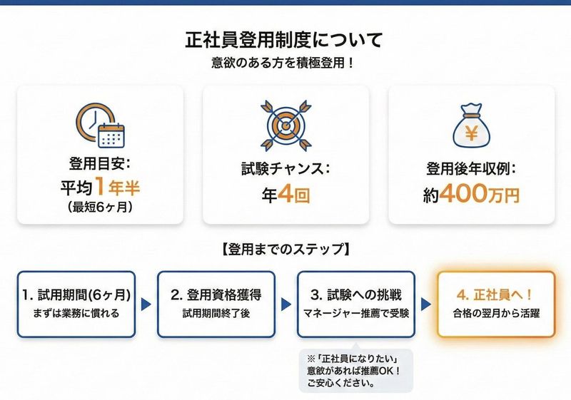 求めている人材 未経験歓迎、学歴不問! フリーターからのステップアップを目指す方 飲食店、小売り、営業など、 他業種での接客・対人スキルを活かしたい方 地元で長く安定して働きたい方