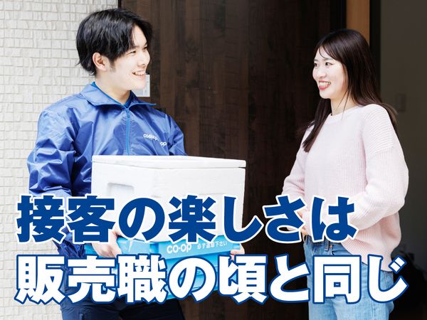 仕事内容 ■新卒で大手スーパーに就職 ―――――――――――――――――――― 流通系の大学を卒業して、 スーパーを展開する会社に入りました。 将来は店長として店を運営する。 さらによい商品をより安く提供するために、 仕入れや物流の仕組み、 店舗のシステムを考える。 そんな未来を想像していました。 もちろん最初は店頭からのスタートです。 レジや品出し、お客様のご案内など、 一通りの業務を経験し、 4年目には日配部門の主任に昇格。 商品構成、仕入れ、販促企画などにも 携われるようになりました。 ■結婚を機に価値観が変わった ー 店舗の営業時間は9:00~22:00。 年中無休がウリなので定休日はありません。 だから勤務時間も休日も交替制です。 もちろん覚悟の上の入社ですし、 月に何日かは土日も休めたので、 特に苦にはなりませんでした。 でも主任になってからは、 お客様の多い土日は、 ほどんど休めなくなってしまいました。 レジ締めや閉店作業を任されることも増え、 だんだん夜も遅くなってきました。 自分はそれでもいいと思っていましたが、 結婚して、娘ができてから、 価値観が大きく変わりました。 このまま店長になれば、さらに忙しくなる。 妻の育児負担は増えるばかりだし、 家族で過ごす時間も取れなくなる。 この仕事をずっと続けるより、 働き方を変えたほうがいいと 思うようになったんです。 ■土日休みの仕事を探してコープに出会う ー 転職先探しは当然、 「土日休みの会社」を軸に進めました。 でも経験を活かせる小売業は、 どこもスーパーと同じような勤務シフト…。 そんな中で見つけたのが生協の募集です。 カタログで食品などの注文を受けて 翌週に商品をお届けする「生協の宅配」は、 いわば宅配型のスーパーです。 これなら経験や知識も活かせます。 さらに土日休みに加え、残業もほぼナシ。 これは望んでいた以上の条件でした。 ひとつだけ不安だったのは「宅配」です。 運転は嫌いじゃなかったんですけど、 仕事で車に乗ったことはありません。 でも「普通免許があれば大丈夫」、 「研修体制も充実」という言葉を信じ、 挑戦してみることにしたんです。 ■家族との時間が激増、生活が一変! ー 入社後は4日間、丁寧な研修がありました。 2日間は生協や宅配サービスについて学び、 後半2日は安全運転のための実務研修です。 車はハイエースよりも少し大きい1.5t車。 練習コースで実際に乗ってみると 普通車感覚で運転できたので、 入社前の不安はすぐに解消されました。 勤務は9:30~18:30。 多少の残業は覚悟していたんですが、 実際は18:40頃には誰もいなくなるんです。 毎日、家族で夜の食卓を囲めますし、 朝もちょっと遅めなので、 2歳になった娘を保育所に送っていけます。 そして何より、いまは土日の休みを満喫中。 みんなで買い物に行って食事をしたり、 動物園やテーマパークを楽しんだり…。 これがフツウの生活かもしれませんが、 わが家では革命的な変化です。 妻も嬉しそうで、表情が明るくなりました。 娘と接する時間も劇的に増えて、 「パパ、パパ」とまとわりつくようになり、 ちょっと困っています(笑)。 ■接客の楽しさを思い出した ー お客様は生活協同組合に加入されていて 長く宅配をご利用いただいてるお宅ばかり。 いまは1日に65~70件ほどを回っていますが、 訪問するたびに関係が深まるのを感じます。 「先週の○○、美味しかったわ」 「ありがとうございます!」 「このポン酢、減塩で添加物なし! コープのオリジナル商品でオススメです」 「じゃあ、1本注文しておくわね」 そんな会話を楽しみながら、 スーパーの新人の頃の 店頭での接客を思い出しています。 前職での知識も活かせていますし、時には 「このパッケージ、開けにくいのよ」 「もうちょっと少量だったら買うのに」 といったお客様の声を、 本部にフィードバックしたりもします。 考えてみるとこれ、 流通・小売の最前線ですね。 スーパーでもたくさんのパートさんの 指導やシフト管理をしていたので、 主婦さんとの会話は得意なんです。 もちろんお客様ですから 丁寧な対応が必要ですが、 もう注意したり、シフトで揉めたり みたいなことがないので、 逆に気は楽かもしれません(笑)。 ■圧倒的な安定感に妻も安心 ー 前職も会社として安定はしていましたが、 100年ほどの歴史を持つ生協は、 さらにどっしり安定しています。 いまは月給も25万円を超え、 賞与が年間4.3ヶ月分、安定して出るので、 年収も前職と変わりません。 妻は大きな会社への転職は無理だろうし、 多少給与が減るのは仕方ないと 思っていたみたいですが、 いい意味で想像を裏切ることができました。 私より安心感が強いかもしれません。 こには私のほかにも、 販売・接客・サービス・飲食など、 異業種からの転職者がたくさんいます。 そして休みや勤務時間が シフト制だった人たちは例外なく、 「やっぱり土日の休みはいいよな」 「固定時間の勤務は