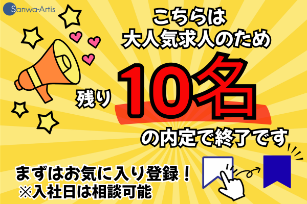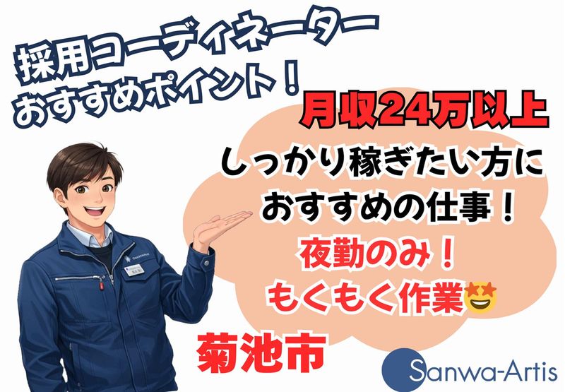 選考プロセス ―――ご登録について――― ① オンライン登録 スマホやタブレット、PCがあればいつでも登録ができます。 ※履歴書は不要です。 ② サンワアルティス事務所での面談登録 住所▶熊本県菊池市泗水町吉富205-4 ①または②のいずれかを選べます。 どちらも事前予約が必要となります。 ご希望は採用窓口までご連絡ください。 <採用窓口> TEL▶0120-880-889 【派遣元責任者より】 本日は数あるお仕事の中から、サンワアルティスの求人をお読みいただき、誠にありがとうございました。 お仕事条件はご希望に沿う内容でしたでしょうか。 また、わかりづらい表現などはございませんでしたでしょうか。 少しでも不安な点やご応募前に確認したい点などございましたらどうぞご遠慮なくお問い合わせください。 このお仕事(本求人では)は情熱あふれるコーディネーターが、あなたの専属担当としてご希望条件のヒアリング、職場見学、お仕事開始後のお悩み相談を責任もってご対応いたします。 最後になりますが、本日はご閲覧いただき誠にありがとうございました。 心より御礼申し上げます。 派遣元責任者 派遣事業部 次長 穴井 雄輔 080-8560-7040