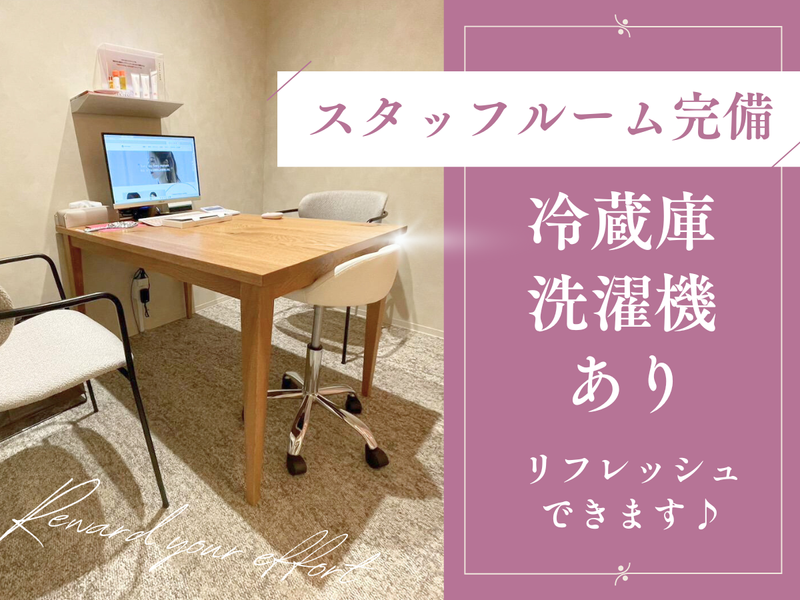 【保険制度】 雇用保険、労災保険、健康保険、厚生年金 待遇・福利厚生 【福利厚生】 ◆社会保険完備 ◆交通費規定支給(月3万円まで) ◆制服貸与 ◆健康診断(定期健診) ・・・・・・・・・・・・・・・・・・・・・・・・・・・・・・・・・ ✅<従業員割引あり>  ̄ ̄ ̄ ̄ ̄ ̄ ̄ ̄ ̄ ̄ ̄ ̄ ̄ クリニックでの施術や 治療、コスメの各種割引あり! 本人だけでなく、 家族や友達の割引もありますよ♪ ▽人気メニュー ・ボトックス ・ヒアルロン酸 ・サルペ注射 ・LDM* ・チタニウムリフティング* ※「*」の2種は、最近特に人気です! ▽割引例 ・家族:定価の20%オフ ・本人:定価の30%オフ ※コスメは定価の40% ・・・・・・・・・・・・・・・・・・・・・・・・・・・・・・・・・ ✅<スタッフルーム完備>  ̄ ̄ ̄ ̄ ̄ ̄ ̄ ̄ ̄ ̄ ̄ ̄ ̄ 広々としたスタッフルームには、 冷蔵庫・洗濯機を備え付け。 差し入れのお菓子やお茶等もあるので、 休憩時間はしっかりと リフレッシュできます!