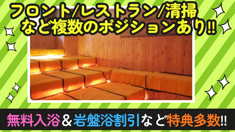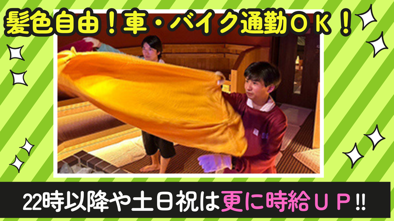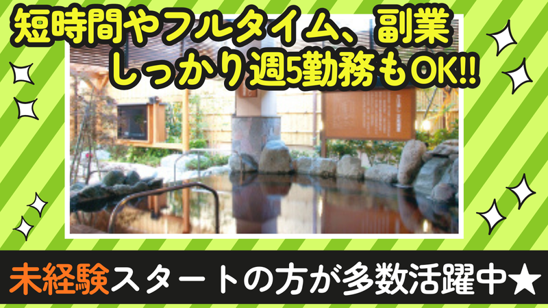 求めている人材 ✅未経験者、大歓迎! ✅ブランクOK! ✅主婦・主夫歓迎!フリーター歓迎! ✅年齢不問!経験不問! 資格不問!男女不問! ※高校生はごめんなさい。 ✅20代活躍中、30代活躍中、 40代活躍中、50代活躍中 ✅ミドル活躍中! 正社員、契約社員、アルバイト、パートなど 雇用形態に関係なく 天然温泉施設の館内スタッフの (受付・接客・清掃など) 経験がある方は大歓迎です! ✅ 活かせるスキル・経験 ・ホテルや旅館のフロント、接客経験 ・飲食店やコンビニなどの販売・レジ業務 ・清掃スタッフ、客室清掃の経験 ・コミュニケーション能力を 活かした接客・サービス経験 ✅ こんな方にピッタリ! ・温泉やスパ施設が好きな方 ・人と接することが好きな方 ・落ち着いた環境で長く働きたい方 ・シフトの融通が利く職場を探している方 ・未経験から接客やサービス業 にチャレンジしたい方 未経験OK&研修充実で安心! 先輩スタッフがしっかりサポートするので、 初めての方でも安心して働けます◎ 「接客スキルを磨きたい」 「安定して長く働きたい」 そんな方をお待ちしています!