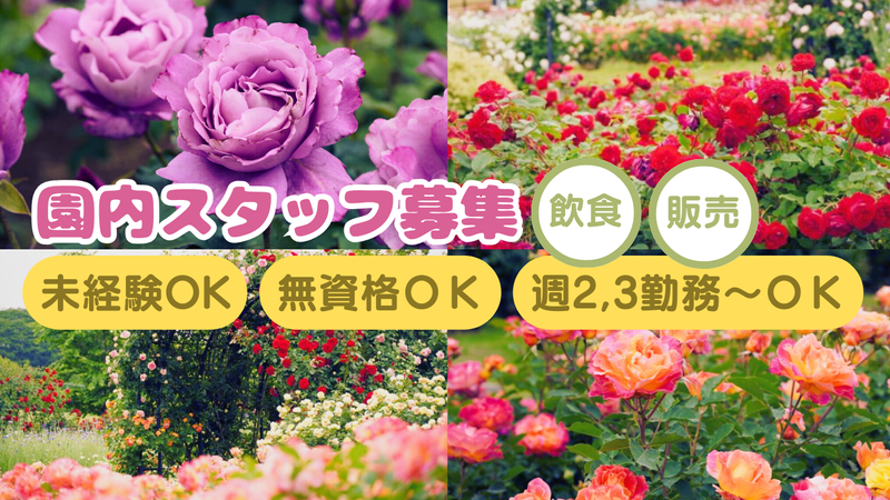 仕事内容 ✿✿✿✿✿✿✿✿✿✿✿✿✿✿✿ 4月~6月末までの短期募集! ✿✿✿✿✿✿✿✿✿✿✿✿✿✿✿ 春バラに囲まれた素敵な園内で 一緒に働きませんか? ✿お仕事内容  ̄ ̄ ̄ ̄ ̄ ̄ ①飲食系ポジション (レストラン・カフェでのお仕事) ・接客、レジ業務 ・簡単な調理、ドリンク作成 ・店内の清掃(調理器具なども含む) ・洗い場業務 など ②販売接客系ポジション (エントランス・マーケット・インフォメーションでのお仕事) ・接客、レジ業務 ・チケット販売、パスポートの発券 ・ご来園者へご案内、パンフレット配布 ・商品の陳列 ・店内の清掃 など