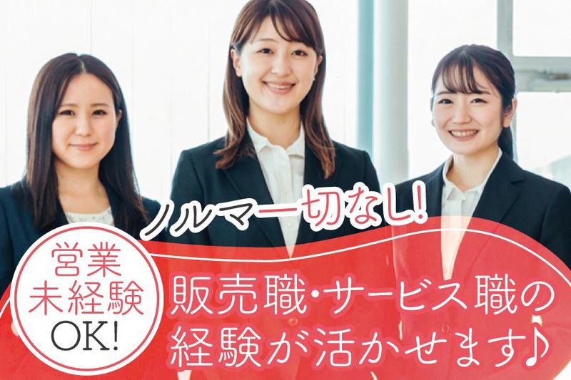 求めている人材 ◎女性活躍中 ◎営業未経験大歓迎 <こんな方にはぴったり> ・販売やサービス職の経験がある方 ・人と話すことが好きな方 ・相手との関係構築好き(得意)な方 ・周りへの気配りができる方 ・正社員の求人をお探しの方 【 下記のような方は歓迎 】 ・法人営業、個人営業問わず 営業職の経験がある方 ・提案営業、ルート営業、 ラウンダーなどの経験がある方 ・ルートセールス、テレアポなどの 経験がある方 ・アパレルショップや食品、スーパー、 雑貨屋などでの勤務経験がある方 ・販売スタッフ、接客販売の経験がある方 ・受付や案内スタッフなどの 接客業の経験がある方