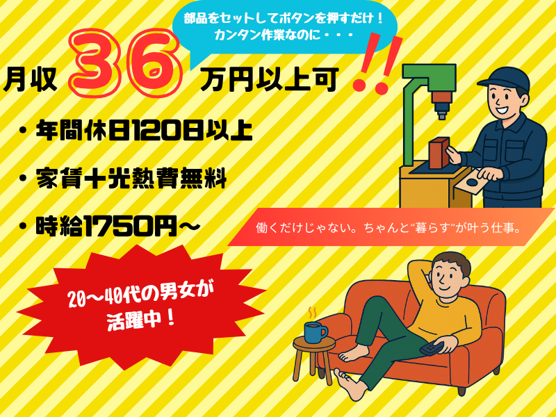 仕事内容 …‥・★<ここがポイント>★・‥… ⭐採用率はなんと!90%以上 ⭐時給1750円~! 【安定×高収入×未経験OK】 トランスミッションという タイヤに伝える役割を持つ部品の 製造スタッフ募集◎ 大手企業で、安心の長期勤務を 実現しませんか? ◆◇─────────────◇◆ 【お仕事の魅力】 ◆◇─────────────◇◆ 自動車の“走る”を支える重要な 部品(トランスミッション)を 製造するお仕事です! この部品は、車の動力をタイヤに伝える、 いわば「心臓」とも呼べる重要なパーツ。 そんな部品づくりに、 あなたのチカラを貸してください! ◆◇─────────────◇◆ <仕事内容> ◆◇─────────────◇◆ 作業はすべてシンプルで、 研修やフォロー体制もバッチリ整っています。 配属後は、3つの業務のうち いずれか1つに“専属”で携わっていただきます。 - 【1】加工 (マシンオペレーター) - 金属部品を機械にセット → ボタンを押す → 出来上がりを確認 - 【2】組立 (工具使用・モクモク系作業) - 手のひらサイズの部品などを、 工具(電動ドライバーなど)で組み立てます。 1人でコツコツ・静かに集中して 進める作業なので、未経験でも安心! - 【3】鋳造 (製造機械のサポート・補助作業) - 鋳造といっても、むずかしい工程は すべて機械が担当! あなたには、その機械の 動作補助や確認作業をお任せします。 ◆◇─────────────◇◆ 【この求人のおすすめポイント】 ◆◇─────────────◇◆ ✅大手メーカー勤務で安心! 景気に左右されにくい安定基盤。 福利厚生も充実しており、 長期勤務にぴったりです。 - ✅未経験OK! 丁寧な研修と先輩のフォローで、 ゼロからのスタートでも しっかり成長できます! - ✅重作業ナシ! 「工場=きつい」イメージを くつがえす働きやすさ。 重量物の取り扱いがないため、 身体への負担が少ないお仕事です。 - ✅作業は単純&マイペースOK! 難しい作業や複雑な判断は 一切ナシ!同じことを 繰り返すことが得意な方に最適。 - ✅長期安定+高収入も可能! 安定した収入と、無理のない働き方が 叶います。家計も将来も安心!
