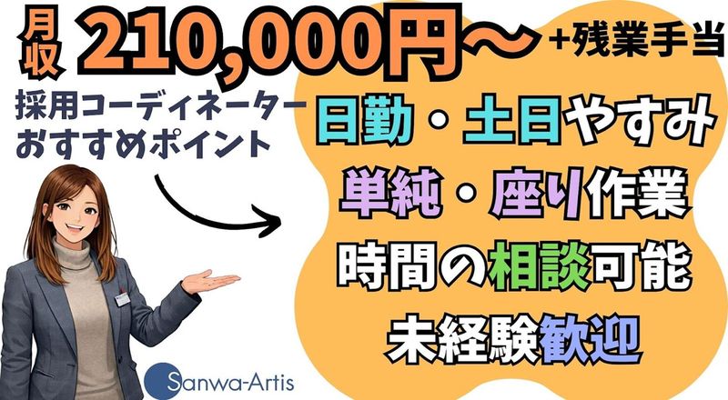 選考プロセス 1.応募 ↓ 2.担当者より面接日程の調整などのご連絡を致します ↓ 3.面接実施(オンライン面接・職場見学も可能) ↓ 4.採用決定のご連絡 ↓ 5.入社手続き等・お仕事開始 ※スピード面談・スピード採用を実施しています。 ※オンライン面接も可能です。 ※事前の職場見学も可能です。 ※履歴書は不要です。 ※入社日はご相談ください。 ※お友達と一緒にご応募もOKです! <担当者> サンワアルティス株式会社 採用担当者 TEL:0120-880-889 携帯:080-8560-7040