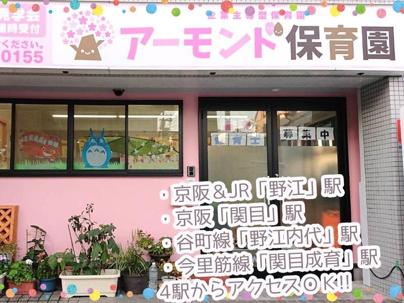 仕事内容 \少人数でのびのび保育/ ✨こんなに自由なの!?✨ とびっくりされる保育園です ✅職場見学OK ✅月給25.1万円~&福利厚生充実 ✅20代~70代が在籍中! ✅新卒・ブランクある方も歓迎 ✅企業主導型で安定した運営 保育スタッフ(保育士) 定員19名の0~3歳児の保育をお任せします。 ・担任業務 ・給食の配膳 ・調理補助 ・戸外遊びや制作作業など ※持ち帰り業務なし※ 少人数・1フロアでのびのび保育が可能♪ フォロー体制が万全なので未経験スタートでも安心です!! ✨-ここがポイント-✨ 企業主導型保育園のため、安心して長く働ける環境を整えているのがポイントです!! 給与も平均より少し高めに設定。残業はほとんどなく、持ち帰りの仕事はありませんので、メリハリをつけて活躍して頂けます。 日曜日・祝日を含む週休2日制を採用しています。働きながらプライベートの時間もしっかり確保できますよ。 ✨-園長より-✨ はじめまして、アーモンド保育園の園長です(^^) 当園の求人を見ていただきありがとうございます。 アーモンド保育園は、生後6ヶ月から3歳までのお子様をお預かりしている19名定員の小規模保育園です。 少人数でワンフロアなので、子ども達の行動や様子を見守ることができ、園児一人ひとりに向き合えるため、子ども達の成長を見守り、教育することが可能です。 私立等の保育園で働いていた方はびっくりされるかもしれません! 決まったルールは少なく、柔軟に周囲とコミュニケーションを取りながら楽しく保育しています。 今在籍しているのは20代から70代までの女性です。それぞれ世代は違いますが、子どもが好きで保育に真摯に向き合う真面目で優しいスタッフばかりです。 保護者の方にも大規模園よりも距離が近く、コミュニケーションを多く取っているため、より一人ひとりの子どもに向き合うことが可能です。 チームワークが良い&温かい雰囲気の当園で、あなたらしい保育を追求していきませんか? 職場見学も受け付けていますので、ぜひ一度見に来てみてください! ✨-アクセス抜群-✨ ・京阪本線「関目駅」 ・京阪本線「野江駅」 ・JRおおさか東線「JR野江駅」 ・地下鉄今里筋線「関目育成駅」 ・地下鉄谷町線「野江内代駅」 それぞれから徒歩5~7分以内でアクセス可能です! \ホームページはこちらから/ ―――――――――――――――― 「園の雰囲気を知りたい!」などは 【https://almondhoikuen.com/】でチェック✨