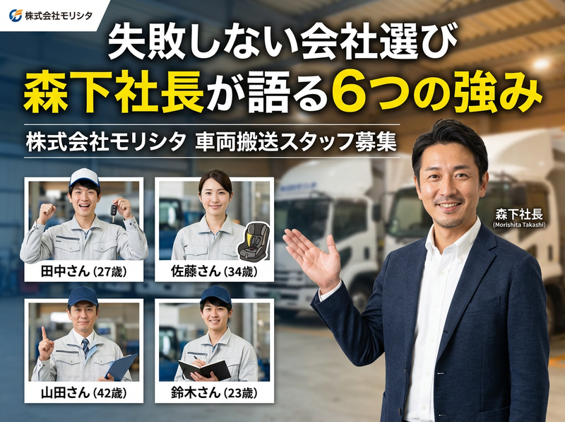 仕事内容 株式会社モリシタ 「リアルな現場の声」 ~多様な社員が語る、 それぞれの働き方スタイル~ 【入社2年目・田中翔太さん(27歳)】 車好きから始まった「とある1日」 朝6:30 高石市の1Kアパートにて 目覚ましより早く目が覚める。 今日運ぶ車のことを考えながら コーヒーを淹れる。 「今日はどんな車に会えるかな」って、 まるで新しい友達に会いに行くような気持ち。 天気予報をチェックして、 雨なら特に慎重運転を心がける 準備をする。 7:45 出社・同僚との何気ない会話 事務所に着くと、先輩の佐藤さんが 既に車両点検をしている。 「田中くん、今日は外車多いで〜、 気ぃ引き締めていこな」 なんて声をかけてもらう。 この軽い雑談が、 一日の緊張をほぐしてくれる。 9:00 BMW X5との出会い 今日最初の車両は高級外車BMW X5。 正直、2年経った今も緊張する。 それは怖いんじゃなくて、 「この車を大切に運びたい」という 責任感からくる緊張。 エンジンをかけた時の音、 シートに座った時の感触、すべてが学び。 普通に生活していたら 絶対に運転できない車に乗れるって、 本当にラッキーだと思う。 12:00 昼食・同僚との車談義 近くの定食屋で先輩と昼食。 「今日はどんな車だった?」が 定番の会話。 佐藤さんは「昨日、初代NSX運んだんや! もう興奮して夜眠れへんかった」 なんて話してくれる。 車好き同士だから、 仕事の話が趣味の話にもなる。 14:00 午後は軽自動車・違いを楽しむ 午後は軽自動車の搬送。 BMW X5から軽自動車に乗り換えると、 「こんなに違うのか!」って毎回驚く。 車種によって運転感覚が全然違うのが 面白くて、「今度はどんな車かな?」って 期待感が止まらない。 17:30 帰宅・ゲームでリフレッシュ 家に帰ったらPS5でレーシングゲーム。 仕事で実際に運転した車が ゲームに出てくると、 「あ、この車知ってる! 実際はもっと重量感があるんだよな」 なんて思いながらプレイ。 リアルとゲームの違いを楽しめるのも、 この仕事ならでは。 田中さんのスタイル: 「車との出会いを大切にする、成長実感型」 【入社5年目・佐藤美香さん(34歳)】 女性ドライバーが見つけた 「安定とやりがいのバランス」 朝7:00 3歳の娘と朝の時間 「ママ、お仕事がんばって!」 娘の元気な声で一日がスタート。 以前のコールセンターの仕事は 夜遅くまでだったけど、 モリシタは17時には帰れるから、 娘との時間が確実に取れる。 これが一番の決め手だった。 8:00 出社・チームでのコミュニケーション 「美香さん、今日は軽めの車両中心やから 安心して」と森下社長が声をかけてくれる。 男性ばかりの職場だけど、 変な気を遣われることもなく、 一人のドライバーとして接してもらえる。 9:30 プリウスで初搬送・丁寧さが武器 今日最初はプリウス。 私の強みは「丁寧さ」だと思っている。 男性陣のようにパワフルな運転は できないけど、細かい部分への気配りは 負けない自信がある。 車内の清掃チェック、 外装の小さな傷の確認、 お客様への丁寧な対応。 11:00 お客様とのやり取り 搬送先で「女性のドライバーさんは 珍しいですね」と言われることもある。 でも、車両の状態説明や 書類の受け渡しでは、 「丁寧で安心できる」と 評価してもらえることが多い。 これは前職の接客経験が 活かされていると思う。 12:30 昼食・ワークライフバランスの実感 「今日は保育園のお迎えがあるから、 定時で帰らせてもらいます」と伝える。 「もちろん!子どもが一番やからな」と 言ってもらえる環境。 前の職場では言い出しにくかった こういうことが、自然に言える。 18:00 保育園お迎え・娘との時間 「ママ、今日はどんなお車だった?」 娘の質問が可愛い。 「今日は白いプリウスと、 黄色い軽自動車だったよ」と答えると、 「次は何色かな?」と目を輝かせる。 仕事の話が家族の会話になる、温かい日常。 佐藤さんのスタイル: 「丁寧さと家庭の両立を重視する、 バランス調整型」 【入社10年目・山田健一さん(42歳)】 ベテランが語る 「この仕事の本当の面白さ」 朝6:00 経験者ならではの準備 10年の経験で身についた朝のルーティン。 天気、道路状況、搬送車両の事前チェック。 「今日は雨やから、ブレーキの効きを 特に意識しよう」など、 その日に合わせた運転方針を 頭の中で整理する。 8:15 後輩指導・知識の共有 新人の鈴木くんと一緒に出発準備。 「この車、ブレーキが敏感やから 最初はゆっくり踏んでみ」とアドバイス。 10年間で蓄積した車種ごとの特徴を 後輩に伝えるのも大切な仕事。 教えることで、自分の知識も整理される。 10:00 レクサス搬送・プロとしてのプライド 今日はレクサスLS。 高級車になればなるほど、責任も大きくなる。 でも、それがプロとしての やりがいでもある。 「10年前は緊張で汗だくだったけど、 今は車との対話を楽しめる」 そんな心境の変化を感じる。 12:00 昼食・業界話と人生相談 「山田さん、実は転職考えてるんです...」 後輩から相談を受ける。 10年いると、いろ