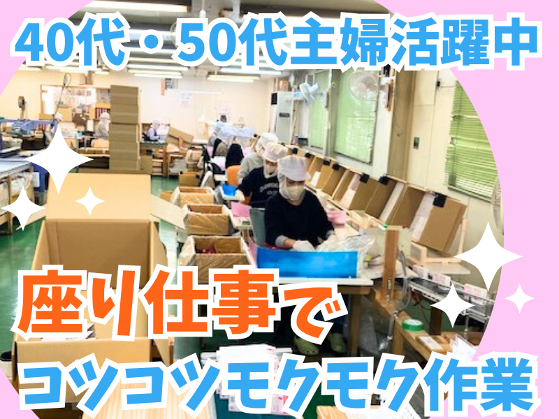 仕事内容 <ここがおすすめポイント> ★シフトは自由申告!決定後も調整OK ★40代・50代主婦さん活躍中! ★扶養内勤務OK!1日4h~OK! ★座り仕事なので無理なく働けます◎ ★休憩時はご自宅に帰ってもOK! 昼食や家事を済ませている人もいます♪ ・。・。・。・。・。・。・。・。・。・ 【シンプル作業!紙製品加工のお仕事】 ヘアケア商品などを入れる紙箱の 組み立てをお願いします(※検品も有) ★1人でできるモクモク作業! コツコツ働きたい方にピッタリです。 ★カンタン作業で未経験でも安心◎ 基本的には同じ作業の繰り返しなので、 1日で慣れる方が多いです。 ★扱うのは軽量で小さい箱です。 重量物なし&座り仕事なので、 体への負担もかかりません。 ▼公式HP▼ 作業風景(動画)がご覧いただけます! https://www.matsuyama-sangyo.co.jp/gyoumu/ ■事業内容 紙製品加工の製造業 ■雇用形態 アルバイト・パート
