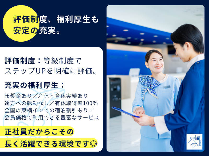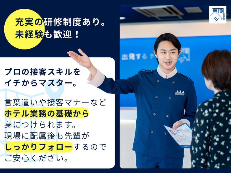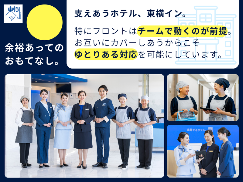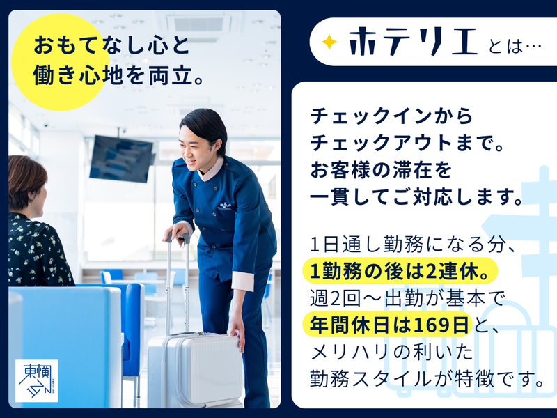仕事内容 【ホテリエ】 お客様の滞在に寄り添い、 上質なおもてなしと 安心感を提供する存在として 東横インは新たなポジションを そう名付けました。 チェックインの「おかえりなさい」から 翌朝の「いってらっしゃいませ」まで。 同じスタッフが顔を合わせることで また帰ってきたくなるような 居心地の良さを、 ホテリエ一同でお届けしています。 そんな一期一会で終わらせないための 接客やホスピタリティを あなたも身につけてみませんか? 未経験スタートも歓迎です。 機械的に仕事をこなすだけの毎日より 自分を誇れる日々の始まりになるはずです。 今より”特別”な自分を目指したいあなたへ とっておきの環境をご用意してお待ちしています。 =============== ⭐仕事内容  ̄ ̄ ̄ ̄ ̄ ̄ ̄ ̄ ホテリエ(フロント)として、 ホテルの“顔”となるお仕事をお任せします。 ・チェックイン、チェックアウト対応 ・予約受付・変更対応 ・客室の備品チェック ・売上日報の入力 ・館内の簡単な清掃など チェックイン~アウトまでを 同じスタッフが担当するため、 勤務スタイルは1回出勤 → 2連休が基本。 また、チームで支えあう体制も しっかり整えられています。 連携がバッチリ取れているからこそ スタッフ一人一人が落ち着いて 接客対応することができます。 ⭐自分時間の充実が余裕につながる。  ̄ ̄ ̄ ̄ ̄ ̄ ̄ ̄ ̄ ̄ ̄ ̄ ̄ ̄ ̄ ̄ ̄ 1回の勤務は長時間になるものの、 週に出るのは2回ほど。 それ以外の日は、 まるごと自分の時間です。 ・平日に映画やスポーツ観戦 ・アウトドアや趣味に思いきり時間を使う ・有給使用して、海外旅行へも 「休みが多い」だけじゃなく、 休みを“ちゃんと使える”働き方です。 だからこそ当ホテルのスタッフは 自分の“好き”に正直。 みんな人生が充実しているから、 ピリピリした空気もありません。 自然な笑顔があふれ、 余裕をもったおもてなしにつながっています。 =============== 【ホテリエ】の仕事のイメージが 少しでも伝わったでしょうか? ホテル勤務が初めてでも大丈夫。 入社後は、接客の基本から 仕事の流れまで、研修でしっかり学べます。 まずは話を聞くだけでも、 お気軽にご応募ください◎ ■Requirements Applicants must hold a residence status with no work restrictions. ■Job Description This position involves providing customer service in Japanese.