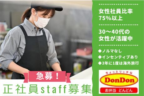 仕事内容 【手づくり・作りたて】にこだわるお弁当店の運営をお願いします 私たちのお弁当の特徴は 「手づくり」・「つくりたて」に こだわっている点。工場で製造され 棚に並んでいるものとはひと味違う、 温もりあるお弁当を提供します。 そのお店の店長として 店舗運営をお任せします。 基本業務(調理・接客)に加え、 管理業務(仕入れ発注・シフト編成・ メンバーの教育など)を 担当していただきます。 【女性社員比率75%以上】30~40代の女性が活躍中です 創業期から変わらず女性が活躍する 企業です。また、直営店ですから店舗間の 仲の良さも特徴です。仕事で困ったことは もちろん、いろいろなことを相談し 助け合える仲間がいますので、 安心してスタートしていただけます。 【ノルマなし・インセンティブあり】意欲次第でステップアップも可能です 直営店ならではの安定した環境のもと、 店長としてじっくり働くことができます。 売上に対するノルマはありませんが、 目標達成度に応じたインセンティブは あります。多店舗展開しているので、 新店を開くことやマネージャへ ステップアップして複数店舗の経営指導に あたることにもチャレンジできます。 【楽しく働く】国内旅行や季節の行事など♪楽しむイベントもりだくさん 当社は「楽しむ」ことを一番大切に しています。仕事を楽しむことはもちろん お月見会や新年会などの季節の催しに加え 毎年5月にバス旅行(飛騨高山、 横浜、幕張etc.)。年間を通して、 様々なイベントを開催しています。 【直営だから安心】創業40年・直営70店舗以上展開の安定企業です。 「HAPPY TOGETHER」を社是に掲げ、 お客様、お取引先、従業員などすべての 人たちが幸せになる店づくりを目指す当社。 多店舗展開していますが、 フランチャイズは1店舗のみ。 直営店ならではの風通しの良さと、 雇用の安定性が大きな特長です。 「地元で腰を落ち着けて働きたい」 という方、ぜひ当社で 長期安定を叶えませんか?