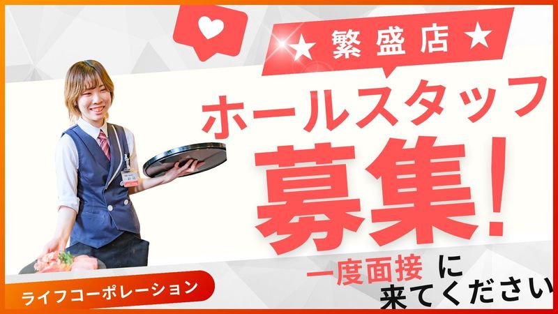 仕事内容 \初バイトでも大丈夫!仲間と楽しく/ 「いらっしゃいませ!」の挨拶からスタート! 優しい先輩や同世代の仲間が しっかりフォローするので安心してください。 チームワークを大切にするお店です! 【仕事内容】 ・お客様のご案内 ・オーダー受付、配膳、ドリンク作成 ・お会計、テーブルの片付けなど 笑顔と気配りで 「また来たい」と思わせる接客を お願いします。 もちろん、 最初は先輩がしっかりサポートするので 安心してくださいね! \他とは一味違う!“味覚園焼肉バイト”/ ・マニュアル接客じゃないから、接客に個性が出せる ・料理の知識が身について、友達に自慢できる ・美味しすぎるまかないが“神”レベル ・スタッフ同士の空気が最高で、仲良くなりやすい ・「人見知りだった自分が、笑顔で働けてる」って先輩談 ◆◇あなたの通勤スタイルに合わせます◇◆ 【車・バイクで通いたい方へ】 広々とした無料駐車場を完備! 自分のペースで快適に通えます。 【徒歩・公共交通機関の方へ】 ご安心ください!冬の寒い帰り道は、 ご自宅近くまで車で送ります! ◆◇ テスト/帰省もOK!希望シフト考慮 ◇◆ あなたの予定を最優先します! 困った時は『お互い様』の気持ちで 助け合える仲間がいるから心強い! / まかない制度について \ *自慢のまかないあり*! 食事補助があります! 北見の味覚をふんだんに取り入れた美味しい料理が楽しめます。 スタッフの間でも人気のまかないメニューがたくさん! 「焼肉店の賄いってこんなに美味しいの?」 と驚くこと間違いなしです! さらに、店舗のグランドメニューもスタッフ特典で*社割あり20%オフ*! 家族や友人とのお食事にも利用されているスタッフがたくさんいます! ▼ライフコーポレーション公式サイト https://life-v.co.jp/ ▼最後に 株式会社ライフコーポレーションは、 北海道北見市に本社を構え、焼肉をはじめとした 多様な飲食業態を展開する外食企業です。 当初は「味覚園」から始まり、 現在では札幌・帯広・北見を中心に、 約20店舗の飲食店を運営。 焼肉、ホルモン、居酒屋など幅広いジャンルで、 地域のお客様に長年愛され続けています。 当社の強みは、「食のすべてを自社で完結できること」。 グループ会社である坂口精肉店では、 和牛の一頭買いや内臓の加工・熟成まで行っており、 味と安全性にこだわった品質管理を徹底しています。 一部店舗では生肉提供の許可を取得しており、 ユッケや生ホルモンといった本格メニューも提供可能。 飲食業界でも珍しい、精肉業との連携による 「一貫体制」を実現しています。 また、当社は「感謝の出来る集団であること」 「お客様に喜びと感動を届けること」を経営理念とし、 日々の営業に取り組んでいます。 おいしさを追求することはもちろん、 スタッフ一人ひとりが笑顔で接客し、 お客様の記憶に残る体験を提供できるように努めています。 社内では人材育成にも力を入れており、 未経験からでも安心して働ける教育体制を整備。 接客・調理スキルはもちろん、 数値管理やマネジメントの研修も充実しており、 アルバイトから社員、店長、そして幹部候補へと 着実にキャリアアップできる環境があります。 北海道の「食」と「人」を大切にしながら、 地域に根ざした店舗展開を進めるライフコーポレーション。 私たちと一緒に、お客様に愛されるお店をつくっていきませんか?