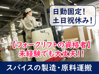 <<エリア高時給1400円!!>>日勤固定勤務!体を動かしたい方におすすめ☆原料の運搬とスパイスを機械に投入するカンタン作業♪