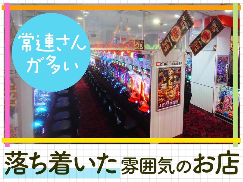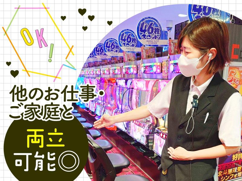 求めている人材 ●主夫・主婦歓迎 ●フリーター歓迎 ●未経験歓迎 ●ブランクOK ●Wワーク・副業OK ●学歴・経験不問 \こんな方、歓迎します!/ ●人と接するのが好きな方 ●チームで協力してお仕事するのが好きな方 ●安心・安定の環境で働きたい方 ●未経験からはじめやすい仕事をお探しの方 ●久しぶりのお仕事で、無理なく働きたい方 ●家事育児の合間に短時間で働きたい ●休みが取りやすい職場がいい ●日中だけ働いて夕方には帰りたい ●同世代の仲間と楽しく仕事がしたい ●正社員登用も視野に入れて働きたい方 ●Wワーク・副業で収入を増やしたい方 応募の理由は何でもOKです♪ ご応募、心よりお待ちしています! <スタッフインタビュー> 私はパチンコもスロットも全くの 未経験で初めはすごく不安でした。 パチンコ店は変わった人が多いのでは? とも思っていました。 ですが、実際働いてみると、 お客さんもスタッフの皆さんも 落ち着いた方が多く、 仕事の内容も掃除や接客がほとんどで 一般的な接客業と大差がなく驚きました。 力仕事も少なく、私でも週5日で 働くことが出来ています。 もちろん未経験な分、遊技について お客さんに聞かれ戸惑うこともあります。 でもそんな時は社員の方や先輩方が 助けてくれました。 いろんな方が支えてくれますので、 未経験でも恐れずに来てください。 私も一生懸命、お仕事を教えるので 一緒に頑張りましょう。 <異業種からのスタッフも多数活躍中> ・カフェや飲食店などでの接客経験 ・スーパーやコンビニでの販売経験 ・一般事務やコールセンター業務など、 あなたの経験がきっと活かせます!