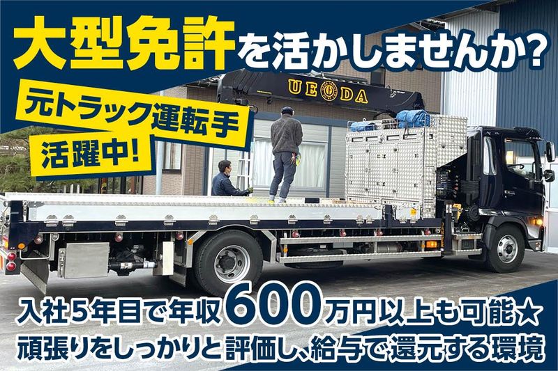 仕事内容 大型免許を活かして働きませんか! 「長距離運転の仕事で身体をこわしてしまった…でもトラック運転の仕事がしたいな」 「ドライバーの仕事だけだと飽きてしまう…体を動かす仕事もあるといいな」 「今の仕事にやりがいがなくて…転職しようかな」 「トラック運転手以外の仕事にも挑戦したい!」 「学歴、職歴が不安…」 そんな悩みも全て解決できます! //////////// ここがポイント!! //////////// ①体に無理なく働けます! 大型トラックの運転はありますが、現場作業のサポート業務がメインです。 現場作業も補助業務なので、ご安心ください。 長距離運転で身体を壊した方も無理なく働ける環境です。 ②運転業務に現場作業に飽きません! それぞれの作業が全く違うので、1日通してメリハリつけて働けます。 身体を適度に動かせるので健康にも良いですよ。 ③残業ほぼ無し! 残業がほとんど無く、1か月8~9日の休みがしっかりとれます。 仕事と休みのメリハリがあり、趣味に家族サービスに 社員みんなそれぞれに休みを謳歌しています。 ④頑張り次第で高収入も可能! 賞与年2回・昇給あり! 頑張りとやる気を給与に反映しています。できることが増えればそれだけ収入もUP! 【年収例】入社5年目(30代)年収600万円 ⑤家賃補助制度があります! 射水市の事務所までの通勤が難しい方でも気軽にご相談ください。 遠方にお住みの方でも安心して働ける環境です。 ⑥やりがいと達成感の感じられる仕事です! 小規模企業だからこそやりがいがあります。 仕事の幅が広く、自分の裁量が大きい環境ですよ。 ////////////////////////////////////////// ◆具体的な仕事内容◆ ・現場作業のサポート業務 お客様の工場などで設備メンテナンスや入れ替え作業を行うスタッフと一緒に現場に赴き、補助業務を行います。 トラックから荷物を積み下ろしたり、使用する道具の準備を行ったりと専門的な知識は不要です。 ・輸送業務 大型トラックを運転し、設備機器や重機、建設資材などを近隣のお客様を中心に輸送しています。 中~長距離輸送(片道300~400km程度)は月に数回程度あります。 ◆仕事をする環境◆ 現場スタッフ(いずれも男性)、事務スタッフ(女性)が在籍中。現場では20代、30代、40代が活躍しています。 1人1人とのとの接点が大きく、仲間意識が強く、新しく採用になった方を"使う"のではなく、成長をしてもらうために一人前に育てあげ、一緒に良い会社を作っていって欲しいと考えます。 仕事中と休憩中のメリハリがきちんとあり、休憩中は趣味や家族などプライベートな話で盛り上がっています。 今後は社員旅行の実施も考えており、さらに信頼を深められる行事を積極的に行っていきます。 ◆先輩からのメッセージ◆ 大型トラック運転手の携わる仕事は、プロとして自分たちしか持っていない知識や技術を駆使して行うため、誇りや自信をもって取り組めます。 また、最初はなかなかできなかったり、コツをつかめなかった仕事が、先輩のアドバイスや経験を通してスムーズにできるようになり、自身の成長を実感した時にとてもやりがいを感じます。 過去には、建設業での作業員やトラックの運転手をしていたスタッフが現在活躍されています。似た業界とはいえども、仕事内容は全く異なるため未経験からのスタート。 0から始める未経験の方の強い味方になってくれますので、わからないことは気軽に質問してくださいね。 トラックドライバーとして一緒に達成感のある仕事をしませんか? ===================== 当社では安全に配慮し、日常の車両点検や適正な休憩を確保しております。 それらの取り組みの成果として、富山県貨物自動車運送適正化事業実施機関が行う巡回指導の評価にて「A評価」をいただいております。 ===================== HPはこちら:https://uedakougyou.co.jp