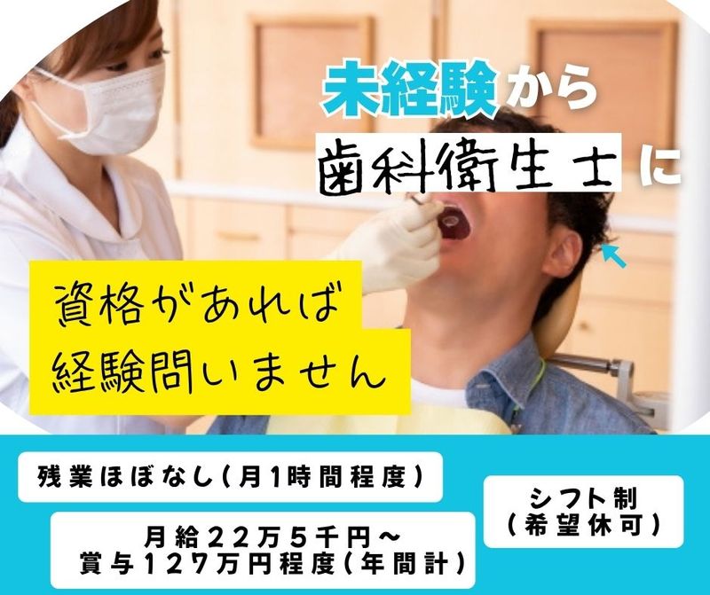 『歯科衛生士』資格があれば経験不問残業なし(月1時間程度)月給22万5千円~賞与年3回あり(業績による)