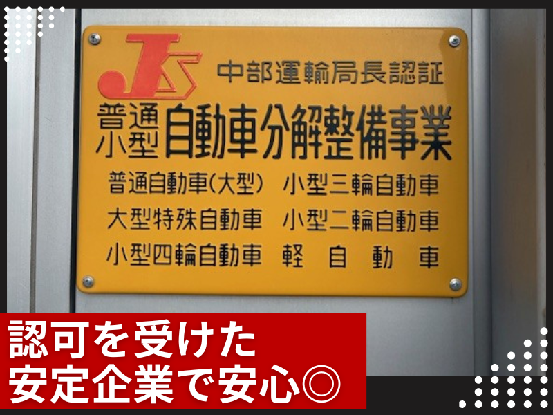 仕事内容 ✨ クルマを世界へ送り出す ✨ ✨ 整備スペシャリスト ✨ 国産車から輸入車、電気自動車まで、 世界へ輸出される 多種多様な車両の整備を担当。 \ 残業は月平均1時間程度! / 整備士としての経験を活かしながら、 「技術に集中できる環境」で、 ワークライフバランスを大切に働けます◎ +………………………………………………+ ✨ スタンダード上場グループ企業で安定 ✨ 残業ほぼなし/土日祝休み ✨ 国産・輸入車・EVなど幅広い車種を担当 ✨ 接客なし!整備に集中できる環境 ✨ 整備士として着実にスキルアップ可能 +………………………………………………+ ■ 仕事内容  ̄ ̄ ̄ ̄ ̄ ̄ ̄ ̄ ̄ ̄ ̄ ̄ 輸出前の自動車整備をお任せします。 国内で整備を終えた車が 世界へ出る前の“最終整備”を担当する、 重要なポジションです。 【 主な業務内容 】 ●車検・定期点検 (12ヶ月点検/24ヶ月点検) ●故障診断・修理 (テスターを使用しての診断、 分解・修理・部品交換など) ●一般整備・メンテナンス (オイル交換、タイヤ交換、 消耗品の補充・交換など) 【 作業環境の特長 】 ✅ お客様対応なし!整備に専念できる環境 ✅ 各整備士が自分の持ち場を担当し、 マイペースに作業可能 ✅ 黙々と作業をしたい方や 集中して仕事を進めたい方に最適です 【 1日の流れ 】 9:00 /一日の作業確認、作業 12:00/昼休憩 12:45/作業確認、作業、部品発注 15:00/休憩 15:15/作業 17:30/1日の作業完了報告 18:00/業務終了 ■ この仕事の魅力✨  ̄ ̄ ̄ ̄ ̄ ̄ ̄ ̄ ̄ ̄ ̄ ̄ ✨ 多様な車両に触れ、スキルアップ可 ✨ 国産車・輸入車・電気自動車など、 幅広い車種を担当できるので、 整備士として技術が磨けます! ✨ ワークライフバランス抜群 ✨ 残業は月平均1時間とほとんどなし! 土日祝休みで、家族との時間や 趣味の時間を大切にできます◎ ✨ 安定した経営基盤 ✨ スタンダード市場上場グループとして、 安定した事業基盤を確立。 長期的に安心して働けます◎ ✨ 自分の裁量で進められる ✨ 接客対応がなく、整備業務に集中可◎ 自分のペースで仕事を進めたい方に ぴったりの環境です!
