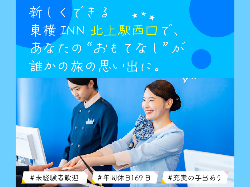 仕事内容 求人のココ!は見て!!  ̄ ̄ ̄Ⅴ ̄ ̄ ̄ ̄ ̄ ̄ ̄ ̄ ̄ ̄ ̄ ̄ ̄ ̄ ✨未経験でも安心の研修制度 ✨頑張りが評価される手当・昇給・賞与 ✨オープニングだから全員同じスタート 来年3月2日、東横INN北上駅西口がOPEN! 新しくホテルを 一緒につくる仲間を大募集!! 「接客は初めて」という人も大丈夫。 同じタイミングで入社する仲間がいて、 ゼロから一緒に成長できる環境があります。 ___________________ 宿泊でお越しのお客様のお出迎え お見送り業務をお願いします。 「おかえりなさいませ。」 「いってらっしゃいませ。」 と元気に挨拶をしてお客様を 笑顔にするお仕事です! ▶翻訳機があるから初めてでも大丈夫◎  ̄ ̄ ̄ ̄ ̄ ̄ ̄ ̄ ̄ ̄ ̄ ̄ ̄ ̄ ̄ ̄ ̄ ̄ 英語が苦手でも問題ナシ! 日本語メインの対応ですので、 安心して接客できます♪ ▶東横INNフロントスタッフの魅力  ̄ ̄ ̄ ̄ ̄ ̄ ̄ ̄ ̄ ̄ ̄ ̄ ̄ ̄ ̄ ✅1回勤務するごとに「2日休み」 →週2回勤務でOK! ✅年間休日169日以上 →趣味・旅行・推し活も満喫 ✅資格取得支援あり。 頑張りは手当・昇給・賞与でしっかり還元 ✅接客未経験・ホテル業界未経験歓迎 「仕事のやりがいも大事、 でも自分の時間も大切にしたい」 そんなスタッフたちが、 多数活躍しています♪ < 先輩フロントAさんの場合 > 【月】10:30~:勤務スタート 【火】11:30~:退勤。そのまま旅行へGO! 【水】休日:推し活でライブ鑑賞✨ 【木】休日:話題のカフェへ→早めに帰宅 【金】10:30~:勤務スタート みんな一緒のスタートだからこそ、 一人じゃない安心感があります。 新しいホテル、新しい仲間、新しい自分―― ここから始めてみませんか?