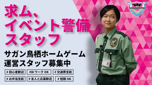 仕事内容 【日本サッカー最高峰のJリーグの試合運営スタッフ】 サガン鳥栖の試合が行われる駅前不動産スタジアムでの警備業務をお願いします。 主に出入口や、スタジアム内各所でのお仕事です。 *警備のお仕事が初めての方も大歓迎 *WワークOK *友人・知人との応募も大歓迎!