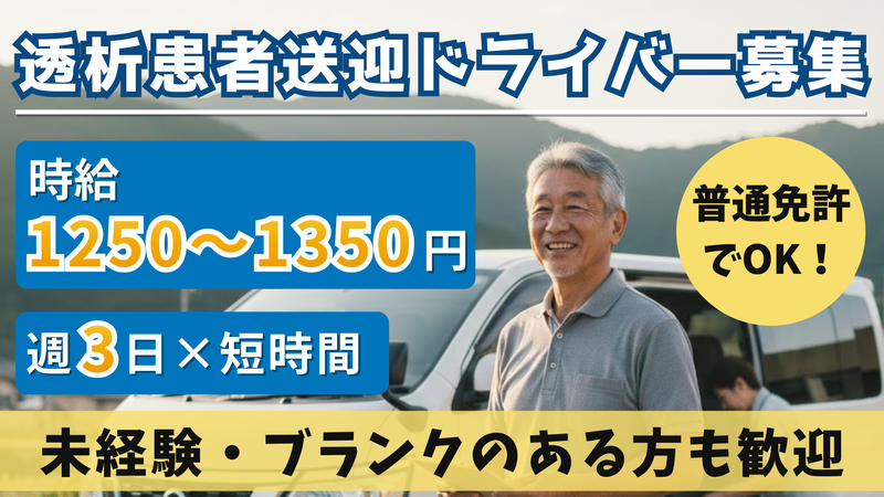 仕事内容 【時給1250円~・週3日】15時半には業務終了! 未経験OKの透析患者様送迎のお仕事(普通免許)。 4月スタートのオープニング募集です! <お仕事内容> 福祉車両のキャラバンを使用し ご自宅⇔病院間の送迎します。 固定ルートなので すぐに慣れていただけます。 送迎以外にも 車両点検・清掃・洗車・給油なども お任せします。 <プライベート充実の勤務> 1日4.75~5.5時間の短時間勤務です。 夕方の早い時間に終わるため、 「お仕事終わりに買い物に行く」 「お風呂にゆっくり入ってリフレッシュ」 等々、午後や夜の時間を贅沢に使えます。 中抜けの時間中も完全自由時間なので 一度帰宅して昼食を食べたり 病院や役所に行ったり等 お昼にも、夕方以降にも ちょっとした用事を済ませられる。 人気な時間帯の勤務です! <中高年・シニア世代が多数活躍中> 入社後は丁寧な研修があるので 50代・60代で 未経験デビューされた方も多数在籍中! 「定年退職後も働きたい」 「運転はまだまだ続けられる」 安全運転を守れる方なら最前線で活躍可能です。 「まずは話だけでも聞いてみたい」という方も大歓迎! お気軽にご応募ください。