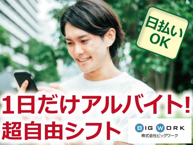 仕事内容 単発アルバイト・軽作業スタッフ大募集! 週1、月1から働けるのでWワークや副業、短期バイトに最適! 学生さんのスキマバイトにもおすすめです! 〈単発アルバイトのポイント〉 〇未経験者大歓迎 〇日払いOK 〇早終わりでも日給保障(最短記録30分) 〇履歴書不要 〇シフト自己申告制 〇週1日、月1日から働ける 〇全額日払いOK(規定有) 【軽作業スタッフの仕事内容】 デスクやイス、段ボールなどを運ぶ、どなたでもできるカンタンな作業です。 搬入や搬出には台車やエレベーターを使用します。 ・事務所移転の手伝い ・搬入、搬出、設置 ・オフィスなどのレイアウト変更 ・廃棄物の搬出 など シフトは自由自在、時間・曜日などあなた都合に合わせて申請できます。 前日までのシフト予約でOK!予定より早く終わったら、すぐ帰宅できます。 その場合も日給は全額支給します。 【こんな方にオススメ】 ・普段は正社員として働いている方 ・お小遣い稼ぎ、副収入を得たい方 ・空いた時間を有効活用したい方 ・バイトデビューしたい学生さん ・体を動かして働きたい方 現在、18歳~40代まで幅広い年代の男性が活躍しています。 友達同士でのバイトデビューにもおすすめ! 会場設営や引っ越しアルバイト、イベントスタッフ、 コンサートスタッフ経験者は即戦力としてご活躍いただけます! この他にも、都内を中心に一都三県にお仕事が毎日あります! 下記より当社の採用情報をご確認ください。 ▼採用ページURL▼ https://entori.jp/bigwork 〈勤務の流れもとっても簡単!〉 ・スマートフォンで前日までにシフト予約 ・お仕事内容確認 ※スマートフォン上での確認となります。 ・最寄り駅へ集合し、仕事先に向かいます ~応募後の流れについて~ 応募→選考→登録→登録完了のご連絡→お仕事の案内の流れになります。 応募完了後、弊社からメールをお送りさせていただきます。 迷惑メールに振り分けられてしまう場合もございますので、ご確認をお願いいたします。 まずは登録からスタート!登録だけでもOK! 面接不要のWEB登録or来社説明会、お好きな登録方法選べます! ※ご応募はお電話ではなく、WEBでお申し込みください。 ※登録後に、いつ・どこでお仕事があるかご確認いただけます。
