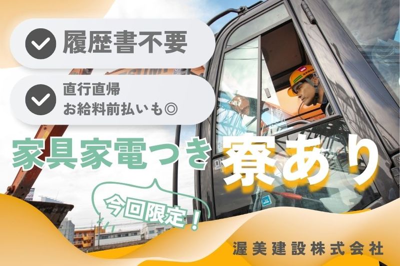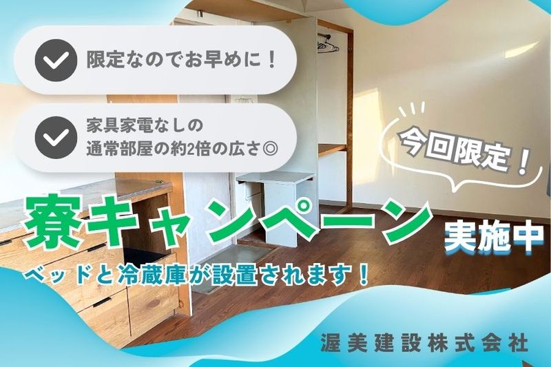 アピールポイント: ━━━━━━━━━━━━━★ 渥美建設で働くメリットをご紹介 当社ならではの取り組み多数▼ ★━━━━━━━━━━━━ ・ライフサポート手当キャンペーン 今回の求人限定!給与とは別で"月額10000円支給" ・寮の特別キャンペーン 家具・家電付きの特別なお部屋をご用意! なんとベッドと冷蔵庫が完備されています☆ ・選べる面接地 面接地は大正本社or心斎橋営業所で選択可能◎ 行きやすい方で、肩の力を抜いて気軽にお越しください♪ ・従業員の安全第一 冷暖房の休憩室、ドリンク支給もあります。 休憩もこまめにとり、無理のない作業を! / 今だけの限定キャンペーンもありますので、 応募はお早めに!迷ったらまずはご応募ください♪ \