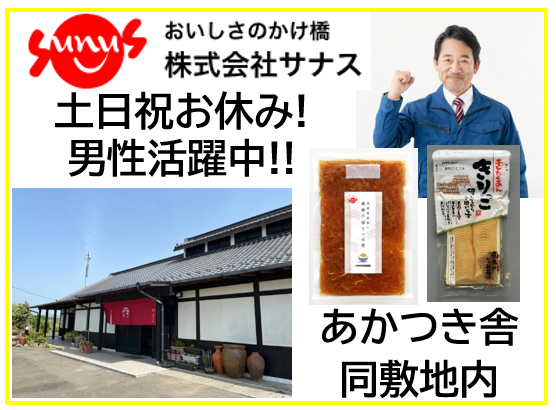 ■アピールメッセージ ・土日祝休み!平日のみフルタイムのお仕事 ・シニア活躍中!定年後でもご活躍いただけます! ・アルバイトスタッフにも賞与年2回あり! ・新商品のお漬物を試食できることも!