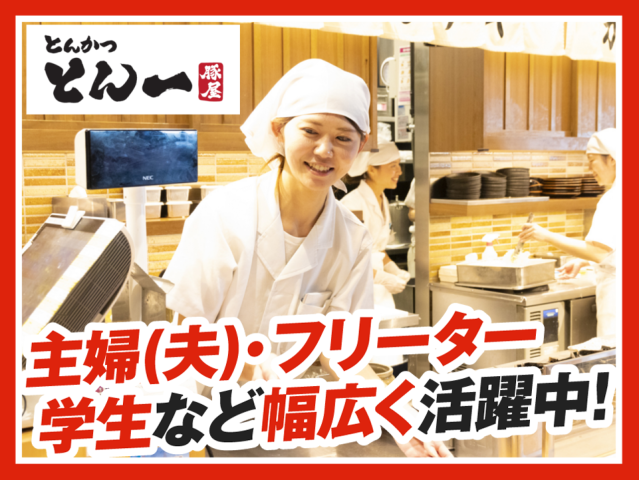 タイトル 経験よりもやる気を重視!学生さん活躍中!!【夕方から効率よく♪】学生さん活躍中!まかない有!週1日~/1日3h~OK◎高時給1150円~! 職種 調理・接客スタッフ(ディナータイム) 雇用形態 アルバイト・パート 仕事内容 ◆◇「切り立て・揚げたて」の豚屋とん一で働いてみませんか? 切り立て・揚げたてを提供している、かつ丼&とんかつ専門店です。 豚肉のカットから衣付け、仕上げまでをお客さまの目の前で行い、旨味のある柔らかいとんかつにこだわっています。 ◆◇活気あふれるオープンキッチンで臨場感を感じられる環境! たくさんのお客さまにご利用いただいている豚屋とん一では、 注文を受けてからお客さまの目の前で調理します。 オペレーションがしっかりしているので、お客さまとのやりとりはスムーズ! オープンキッチンならではの距離感で、お客さまの「美味しそう!」という反応を間近に感じられるのも魅力です。 ◆◇丸亀製麺と同じトリドールグループです◇◆ ◆◇未経験・ブランク有でも充実感!嬉しいまかないも! 初バイト・未経験OK! パン粉つけや盛り付け、とんかつを揚げるなど、 ステップごとの丁寧なトレーニング完備! 1つ1つできることが増えていく達成感があります。 1日やりきった時には充実感がありますよ◎ 最新の厨房機器や食洗機を導入しているので、体力的な負担も軽減。 授業とサークルの合間を活用できる「タイパが良いバイト」。 まかないは1食120円で食べられて、食費を抑えたい学生さんに嬉しい! ※個人差あり ………………………… <プロ顔負けのサクッとジューシーなとんかつが作れる!> ●かつ丼の調理 パン粉つけや、とんかつを揚げる作業など。 衣の分量など分かりやすいレシピ完備◎ ●定食の準備 お茶わんや丼ぶりにご飯を盛り、お味噌汁の準備をします。 ●食材の準備 お肉のカットや野菜などの準備も大切な仕事。 ●レジ業務 タッチパネル式だから操作も簡単♪ お客さまの「ありがとう」が直接聞けるのも魅力です。 ●洗い場/店内清掃 食洗機を積極的に活用!手荒れを防いで効率よく作業◎ お客さまとスタッフが気持ちよく過ごしていただくために店をキレイに。 ☆☆☆豚屋とん一の【3つの推しポイント】 1.高時給1150円&働きやすさピカイチ! 「授業終わりにサクッと稼ぎたい」「土日だけ入りたい」など ライフスタイルに合わせて働けます!短時間の勤務もOK◎ ★22時以降は時給25%UP(深夜割増有)でさらに稼げる! ★週1日~、1日3h~OK!学業やサークル、遊びに合わせて組めます。 ★1週間毎の希望シフト制!テストや長期休暇の予定も立てやすい! ★給与は1分単位で計算!頑張った分はしっかり還元。 2. スタッフ想いの嬉しい待遇が満載! 1食120円で食べられる絶品まかない有! 勤務前にも専用メニューから選んで食べられる! ★交通費月5万円まで支給。 ★制服貸与。 ★スキルUPが収入UPに繋がる明確な昇給システム有。 3.幅広い年代が活躍!温かい協力体制! 10代・20代・30代・40代・50代・60代と幅広い年代のスタッフが活躍中! 学生さん、パート主婦(夫)さん、フリーターさん、中高年の方まで、 様々な仲間が協力し合い、チームワークを重視して、学び合える環境が魅力です。 ★主婦パートさん、大学生さん、シニアの方も活躍中! <働くスタッフの声> ・元気な挨拶をほめられた ・忙しい時間帯に皆で連携してスピーディーに提供できた ・「おいしい」と喜ばれているお客さまの笑顔が嬉しかった ・食材の扱いや揚げ物が上手になった