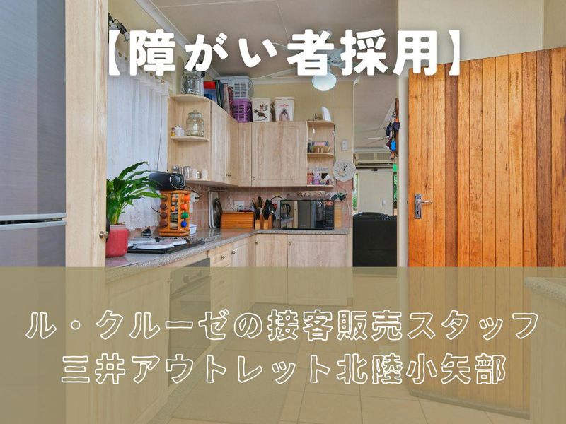 求めている人材 【障がい者採用】 ルクルーゼの接客・販売スタッフ (三井アウトレット北陸小矢部) ###募集概要 時間 09:30~20:30のうち5時間以上 週3日以上入れる方 扶養内OK シフト 希望提出制(月1回) ###選考について 履歴書不要でご応募いただけます。 面接は1回のみ。 支援員さんの同伴も歓迎です。 お店の見学はできませんが、 実際に働いてみる「トライアル勤務」で 雰囲気を確認できます。