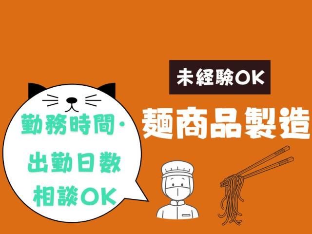 (未経験大歓迎)食品工場での麺商品製造(勤務時間・日数相談OK) ~お客様に、おいしさとともに暮らしの安心を届ける~ 新鮮で良質、低価格という魅力的なヒット商品を 生み出している食品工場でのお仕事です。 ・駅徒歩5分で通勤ラクラク♪ ・無料駐車場完備で車・バイク通勤OK ・未経験・ブランクのある方も働きやすい作業内容です