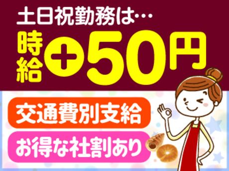 仕事内容 スーパー内のパンコーナー★焼きたて商品をお届けしています♪ ベーカリーコーナーでの簡単製造のお仕事です。 パン作りの経験・知識は必要なし♪ パンの製造・陳列をお願いします。 決まった作業のくり返しなので 未経験&久しぶりのお仕事復帰でも安心です♪ 扶養内でのお仕事などスキマ時間でOK! 「家事や子育てと両立して扶養内パートで」 「土日メインのシフトでWワーク」 …など、希望を教えて下さい☆ ライフスタイルに合わせて無理なく働けます! 早朝と土日祝は時給UP★家計に嬉しい社割あり! ●朝の8時までは…時給+100円! ●土日祝に勤務したら…時給+50円! 食品・日用品がお得に購入できる従業員割引や 交通費支給&昇給有などメリット盛りだくさん♪ 長期安定派の方は社員へのステップUPも可能です!