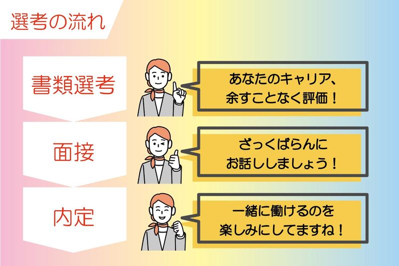 選考プロセス ●書類選考 ↓ ●面接1回 ※面接の日時はご相談可能ですので、お気軽にご相談ください ↓ ●内定 ↓ ●入社 ※面接日・入社日は、ご相談に応じます。 【応募後の連絡】 書類選考を通過した方にのみ、5営業日以内にご連絡いたします。 ※応募者が多数の場合、ご連絡が遅れることがあります。