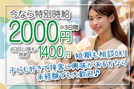 資格 *子どもが好きな方大歓迎♪ *未経験歓迎 *公共交通機関で通勤できる方 *学生OK *主婦(夫)・フリーター大歓迎 *Wワーク・初バイトも歓迎 【 下記のような方は歓迎 】 ・アパレルショップや食品、スーパー、雑貨屋などでの勤務経験がある方 ・販売スタッフ、接客販売の経験がある方 ・受付や案内スタッフなどの接客業の経験がある方
