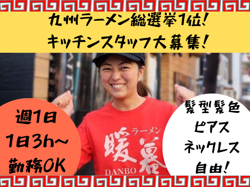 仕事内容 \人気ラーメン店で調理スタッフ大募集!/ \九州ラーメン総選挙1位の絶品賄いが無料/ ✨春から新大学生の方も大歓迎✨ ラーメン暖暮はバイトデビューにもオススメ♪ 授業やサークル優先で働けるから 履修登録前やサークル入部前の応募もOK 未経験からプロの技術を学べるチャンス◎ 1日3h~勤務OKだから家事や育児の合間の勤務も◎ 今後も続々出店を予定しております! <<お仕事内容>> ✅仕込み ✅調理 ✅ラーメンの盛り付け ✅洗い場 など、調理業務全般をお願いします。 最初は簡単な作業からスタートするので、 未経験の方も安心です! スタッフ同士の仲も良く、 分からないことは気軽に質問できる環境です♪ <<ここがPOINT!>> ✨髪型・髪色・ピアス・ネックレス自由! オシャレしながら働けます◎ ✨九州ラーメン総選挙1位の絶品まかない付き! ✨正社員登用制度あり!アルバイトからキャリアアップも可能 <<ラーメン暖暮について>> 私たちにとって、ラーメンはグルメなごちそうではなく、 いそがしい日常のなかでホッと 一息つかせてくれるソウルフードでした。 その思いは福岡県筑紫野市に最初の「ラーメン暖暮」を 立ち上げた平成12年から今日まで少しも変わっていません。 私たちの「暖暮」という屋号は、そんな 「皆さまの日常の暮らしにもホッとできる暖かな一杯を。」 というささやかな思いをこめて名づけました。 <<公式サイト>> http://www.danbo.jp/