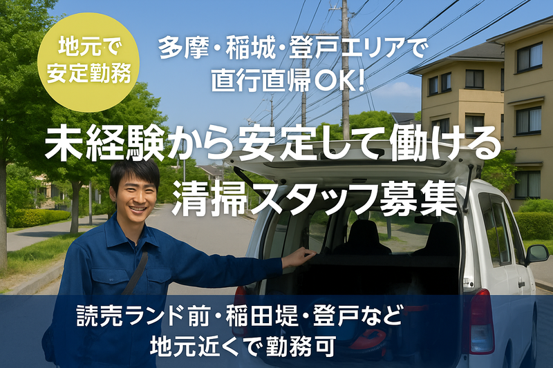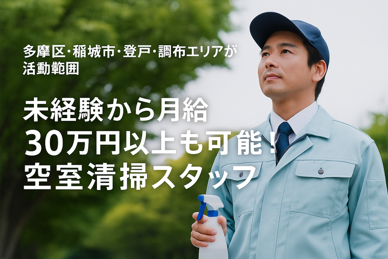 仕事内容 完全週休2日制、賞与年2回、ミドルシニア活躍中、未経験から正社員でがんばりませんか? 地元で安定勤務◎多摩・稲城・調布エリア中心の空室清掃スタッフ/未経験OK・月給25万円以上 「地元で安定して働きたい」「通勤に時間をかけたくない」そんな方へ! 読売ランド前・稲田堤・登戸・調布など、自宅近くの現場に直行直帰OK。 未経験でも月給25万円スタート可の安定職です! 【仕事内容】 賃貸マンションやアパートの入居前や新築物件の“空室”をキレイに仕上げる仕事です。 掃除機や洗剤を使って水回り(キッチン・浴室・トイレ)や床・窓などを清掃し、 ドアノブ交換やパッキン交換など、ドライバー1本でできる**簡単な軽作業(営繕)**も行います。 難しい作業はありません! 最初は先輩と一緒に現場へ同行し、道具の使い方や手順を丁寧に教えます。 未経験からでも、3か月ほどで1人立ちできる環境です。 担当エリアは川崎市多摩区・稲城市・調布市周辺が中心。 自宅から20km圏内の現場に社用車で直行直帰できるため、オフィスに出社する必要はありません。 「地元で安定した仕事をしたい」「一人で黙々と作業したい」方にピッタリです。 【応募資格】 普通自動車免許(AT可)必須 学歴・職歴不問!未経験歓迎 20代~50代活躍中 異業種(配送・製造・営業など)からの転職者も多数! 「DIYが好き」「掃除が得意」そんな気持ちがあれば大歓迎です。 【給与・待遇】 月給25万円~30万円+賞与年2回 昇給・賞与あり(成果を正当に評価) 交通費支給 制服・清掃道具・社用車貸与(通勤利用OK) 【年収例】 入社2年目/年収500万円(基本給+賞与+各種手当) 頑張りがすぐに評価・昇給に反映される仕組みがあります。 【休日・休暇】 週休2日制(シフト制) 有給休暇あり(取得推奨) 長期休暇あり 家庭やプライベートと両立しやすい環境です。 【働きやすさのポイント】 景気に左右されにくい“安定業界” 直行直帰OKで通勤ストレスなし オフィス出社不要で自由度の高い働き方 未経験からでも安心の研修制度 明確な評価制度で、頑張りが給与・昇進に反映! 【勤務地】 〒214-0004 神奈川県川崎市多摩区菅馬場4-3-15 (読売ランド前駅 徒歩11分/稲田堤駅 徒歩17分) 担当エリア:多摩区・稲城市・登戸・調布周辺 【応募方法】 「話を聞くだけ」「まずは見学だけ」でも大歓迎! 応募フォームまたはお電話から、お気軽にご連絡ください。 スマホから5分で応募完了! 履歴書は面接時にご持参いただければOKです。