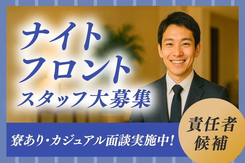 求めている人材 □■ 応募に必要な条件 ■□ *満18歳以上の方 (例外事由2号/深夜勤務につき) *ホテル業界に関心があり、 夜勤業務に前向きに取り組める方 日本語検定N3相当 *お客様対応・館内巡回など、 複数業務をバランスよく対応できる方 *基本的な接客マナーや 報連相を大切にできる方 *ホテルフロントや夜勤の経験を お持ちの方は即戦力として活躍可能! < 求める人物像 > *夜勤での実務経験を活かして ステップアップしたい方 *フロント業務に加え、現場管理や マネジメントにも挑戦したい方 *落ち着いた対応ができる方 *チームワークを大切にしながら、 周囲を支えられる方 *責任あるポジションで、 正社員として腰を据えて働きたい方 ―* 協力的で和やかな雰囲気の職場 *― ■若手〜ミドル層まで、 幅広い年齢層のスタッフが活躍中 ■シフトイン時の引き継ぎや 連携もスムーズで、 安心して業務に入れます ■クレームやトラブル対応も 一人で抱え込まず、連携しながら対応 ■責任者候補としてのチャレンジを、 周囲がしっかりサポートします 年齢の条件と理由:あり(例外事由1号・60歳未満(定年のため))