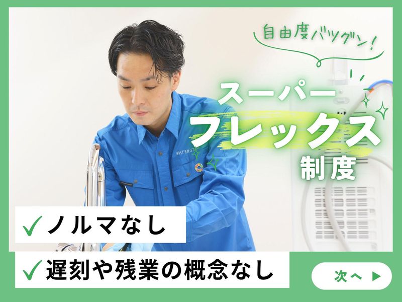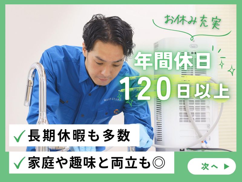 仕事内容 / 未経験でも大丈夫! 心機一転、始めてみませんか? 初めての転職も応援します◎ \ . 業績好調の "ウォータースタンド" 男性スタッフが多数活躍している職場です! 30代~40代の方も活躍中! まずはお気軽にご応募ください! . ================= この求人のポイント♪ ================= ◆経験・スキル不問! <普通免許があればOK>です☆ ◆年間休日<120日以上!> ◆未経験も安心の<サポート体制完備♪> ◆<スーパーフレックス制>で 理想の働き方が実現♪ ◆ノルマはありません!! . . ================= 仕事内容はこちら! ================= ✅設置・交換・撤去・修理  ̄ ̄ ̄ ̄ ̄ ̄ ̄ ̄ ̄ ̄ ̄ ̄ ̄ ご契約されたお客様先にて ウォータースタンドの設置を行います! 設置・修理・お手入れ方法の ご説明などは 入社後にしっかり研修を行うので どなたもご安心くださいね♪ . ✅サーバーメンテナンス  ̄ ̄ ̄ ̄ ̄ ̄ ̄ ̄ ̄ ̄ ̄ ̄ フィルター交換や作動チェックなど 既存のお客様先にて メンテナンスを行います! 1件40分ほどの時間が掛かるので お客様とのお話しを楽しみながら 作業をお願いします♪ お客様は法人から個人まで幅広く、 法人の場合は自治体と協定を結んだり "給水スポット" として さまざまな場所に設置されることも多いため、 「別の店舗でも利用したい!」 「友達の家でも利用したいと言っている」とご紹介をいただくケースもございます。 設置~アフターフォローまで一貫して担当できるので お客様との信頼関係もバッチリ★ . 上記業務をお任せします! 「ノルマ」は無いので ご安心くださいね♪ もちろん、 社用車や制服 タブレットや携帯電話などの 業務に必要なものは貸与! . . ================= 安心の<サポート体制!> ================= ◆入社後、まずは座学研修で 商品知識や訪問マナーなどを 基礎から丁寧にレクチャーします! ◆座学研修後は、OJT研修で 先輩に同行し実際の現場を 学んでいただきます! ◆独り立ち後も 階層別の勉強会や研修を実施♪ . 更に・・ 週に一度、 上長との面談を設けています。 ◎実務上のトラブル解決方法 ◎アドバイス・フォロー などなど・・ 些細なことから 相談できる環境が整っています♪ 安心してご応募ください☆ . . ============== <直行直帰>可能! ============== ご自宅から直接 お客様先へ訪問をし、 そのまま直帰OK! 勤務時間や休日は 自分で決められるので 週休3日の働き方も◎ フレックスタイム制ならではの 働き方が実現可能です♪ あなたが「働きやすい!」と思える ワークライフを見つけていきましょう! . . ============== 1日のスケジュール例 ============== 9時 自宅から出発! 近くのマンションで2件設置 12時 ランチタイム♪ 13時 新規のお客様先へ移動 14時 設置作業で1件訪問 15時半 機種変更希望のお客様先へ訪問 商品の交換と使い方の説明もします 17時 自宅へ直帰♪お疲れ様でした! . あるスタッフの1日の例ですが 上記のような働き方が可能です♪ . . =============== ウォータースタンドについて =============== 当社は、 「 2030年までに日本の 使い捨てプラスチックボトルを 30億本減らします。 」 というミッションを掲げ マイボトルを携帯する 新しい文化を創り、 気候変動とプラスチックによる 環境問題改善に取り組んでいます! 一般のお客様だけでなく 官公庁や公共施設、 企業などのお客様からも 幅広く支持いただいております♪ このような信頼のもと 事業は右肩上がりで成長中! . ☆SNSでも話題のウォータースタンド☆  ̄ ̄ ̄ ̄ ̄ ̄ ̄ ̄ ̄ ̄ ̄ ̄ ̄ ̄ ̄ ̄ ̄ ̄ . // あなたのご応募を お待ちしております! \\