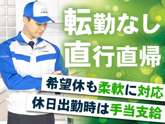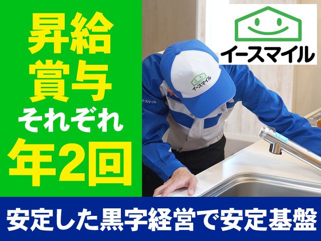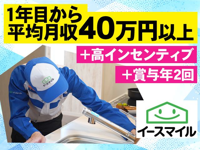仕事内容 \転勤なし!暮らしを守る“水道インフラ”で安定&高収入/ <新着>未経験から始めるライフラインのプロ <給与>1年目から平均月収40万円以上+高インセンティブ <安心>飛び込み・アポ取り一切ナシ!直行直帰で自分のペースで◎ <待遇>工具・社用車・交通費などすべて会社負担&研修あり <イースマイルが選ばれるPOINT> ・ 3つの安定基盤 1.生活に欠かせない水道インフラで長く働ける。 2.全国展開で業界トップクラスの実績あり 3.自分自身で手に職をつけて将来も安心 ・ スタッフの8割が未経験スタート 1ヶ月の研修があるので事前のスキルは不要! 年収600~700万円超えの先輩も多数在籍! <仕事内容> 水回りのトラブルでお困りのお客様宅へ訪問し、 修理や商品のご案内を行う仕事です。 コールセンターからの依頼を受け、 専用車で現場へ直行直帰(片道1.5時間以内)。 修理や提案を行い、本部へ報告して完了。 <社員インタビュー> 20代 自身の頑張りが結果に反映されることが 日々のモチベーションにつながっています。 スタッフになってからはプライベートと仕事のメリハリが付き、 より充実した生活を送れるようになりました。 40代 大阪が本社で有名だった事が大きく、応募を決めました。 研修中は、専門的なことを、 惜しげもなく学ばせていただけることも驚きました。 入社後の変化としては、収入が増えたことが大きいと思います。 妻からは、「会社員の時より生き生きしているね」と言われました。 ~応募~採用まで~ 書類選考→面接1回(WEB面接も可)→研修→ご契約 面接希望日時・業務開始日はお気軽にご相談ください。 皆様のご応募お待ちしております。
